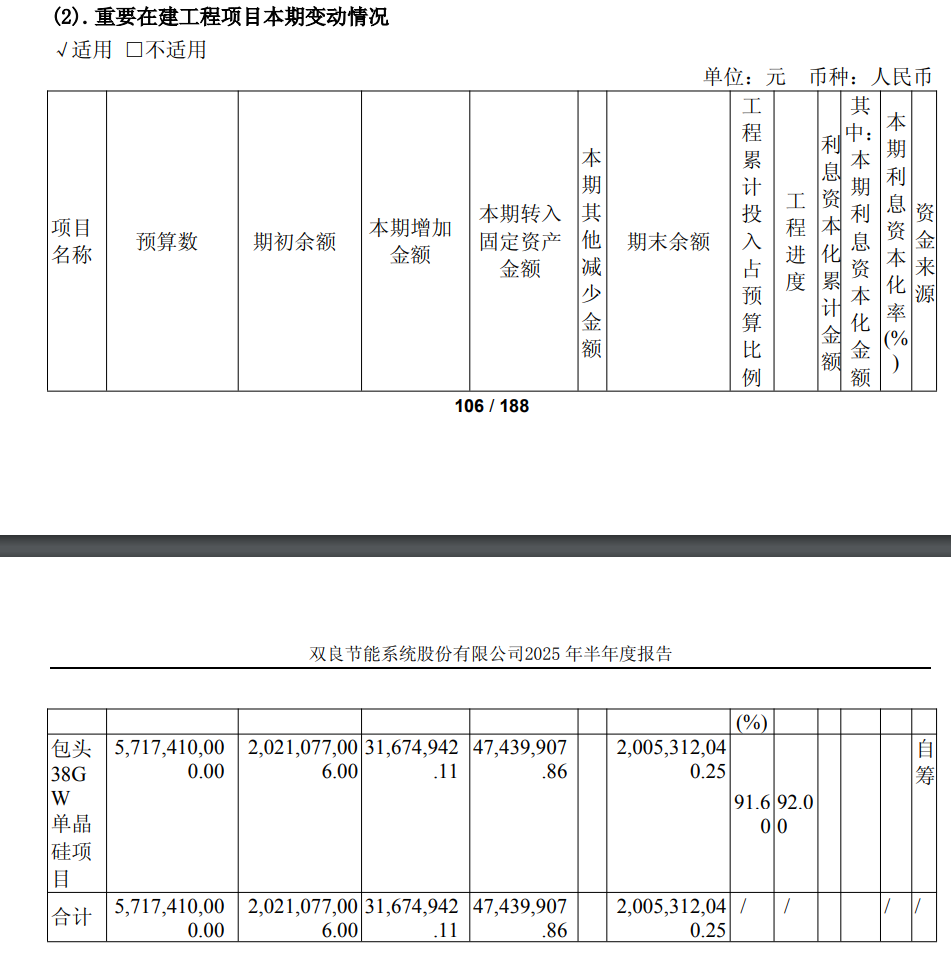 不过,在双良节能的在建工程中,也存在一个包头38GW单晶硅项目,该项目主要从2023年开始,当年年报显示,包头38GW单晶硅项目在建工程余额从期初的15万元增加至37.19亿元,2024年该项目15.9亿元,转固32.88亿元,期末余额变为20.12亿元,工程进度为90%;至2025年6月底,该项目本期增加额为0.32亿元,转固为0.47亿元,期末余额为20.05亿元,工程进度为95%。在光伏行业低迷背景下,双良节能在项目快完工时放慢投入和转固,难逃延迟转固的嫌疑。