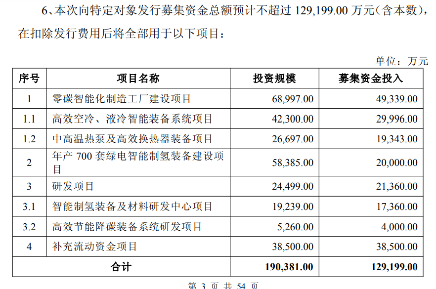 据最新的定增预案,本次募集资金主要用于零碳智能化制造工厂建设项目、高效空冷及液冷智能装备系统项目、中高温热泵及高效换热器装备项目、年产700套绿电智能制氢装备建设项目、智能制氢装备及材料研发项目、补充流动资金,上述项目计划使用募集资金分别为4.93亿元、3亿元、1.93亿元、2亿元、1.7亿元及3.85亿元。不过,上次占定增投资金额超一半资金的光伏项目被砍掉。