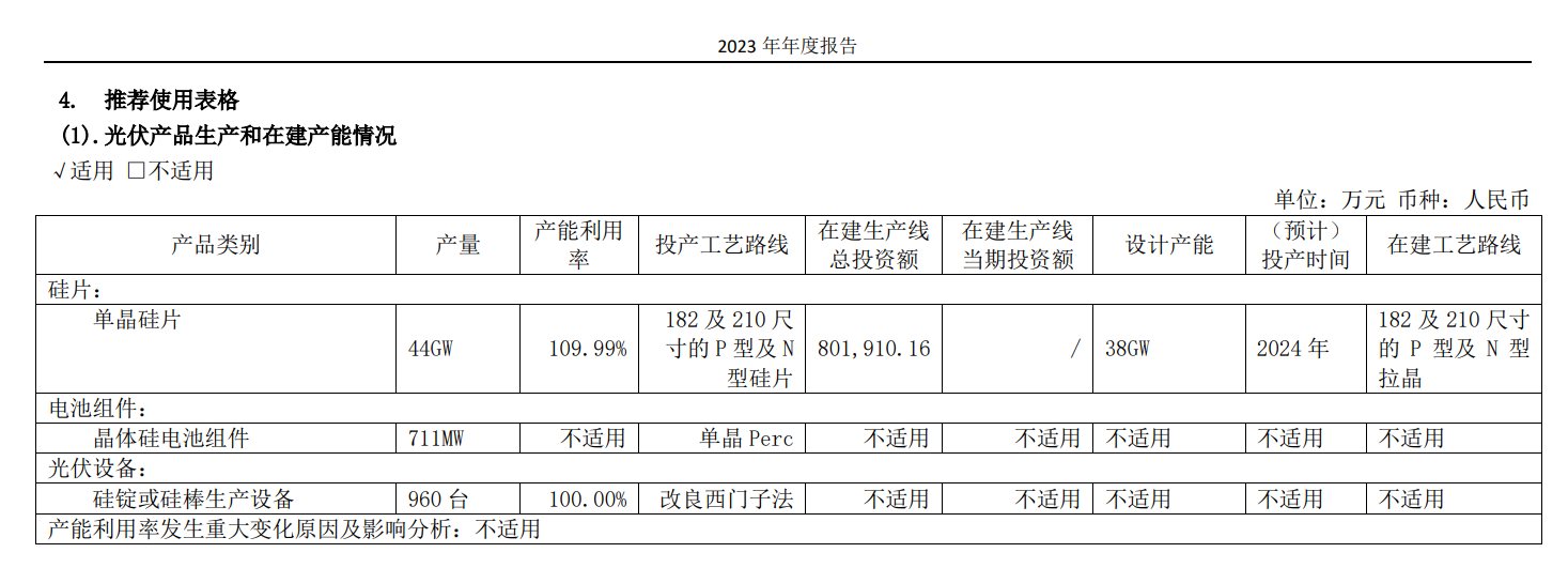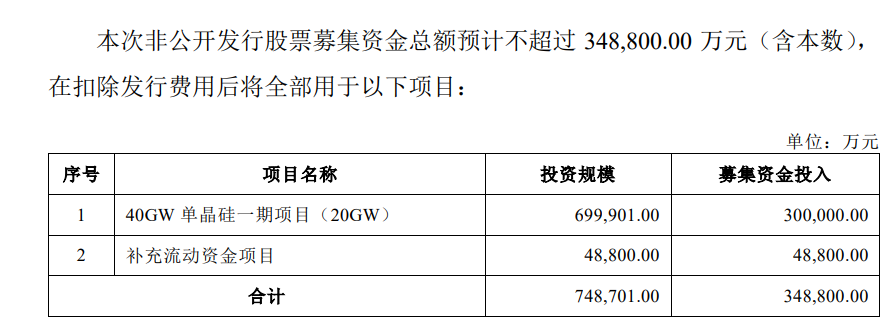 据2023年底的定增预案,当时拟募集不超过25.6亿元,其中16.1亿元用于38GW大尺寸单晶硅拉晶项目。不过,该定增方案并未被推进。
