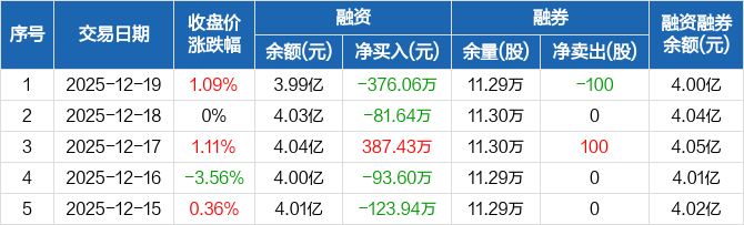 融资方面,当日融资买入892.3万元,融资偿还1268.37万元,融资净偿还376.06万元。融券方面,融券卖出0股,融券偿还100股,融券余量11.29万股,融券余额62.55万元。融资融券余额合计4亿元。