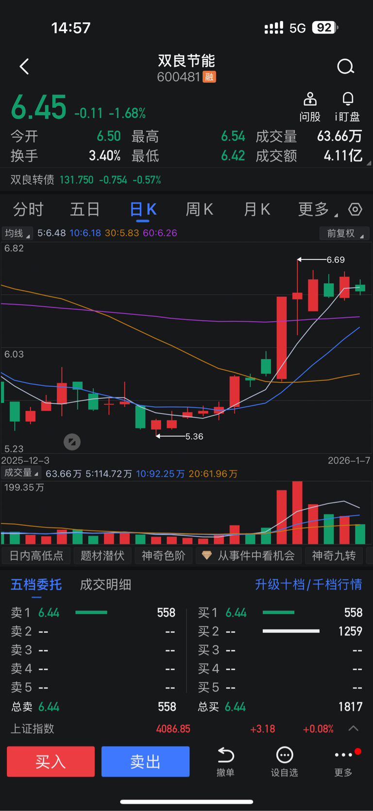 三天行情浪费了,收盘跌破五日线,短期看空,明天估计6.2左右有支撑,先卖出观望一