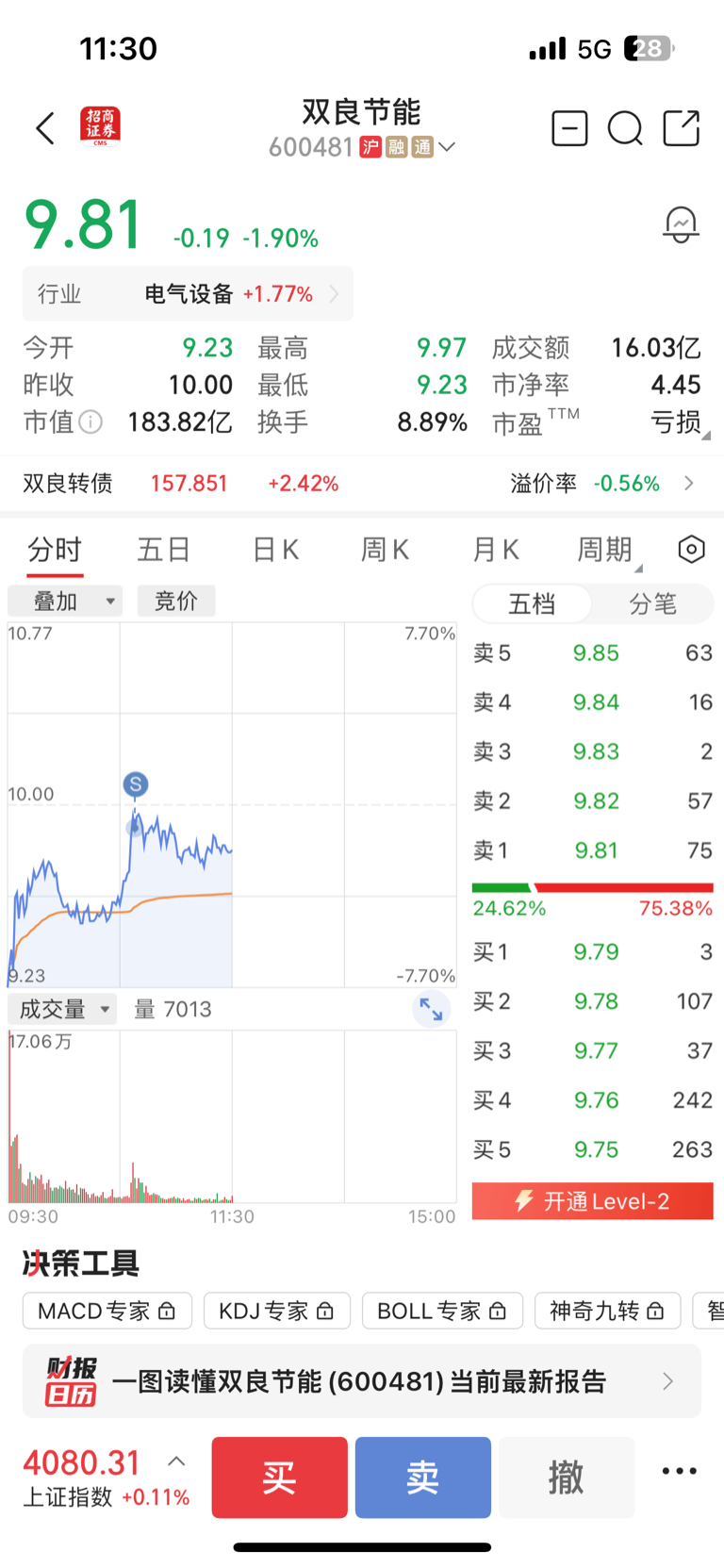 $双良节能(SH600481)$ 昨天转股,今早9.91出掉了,保险起见,用一半继续可转债,我觉得还有行情,三个交易日内大概率反包创新高