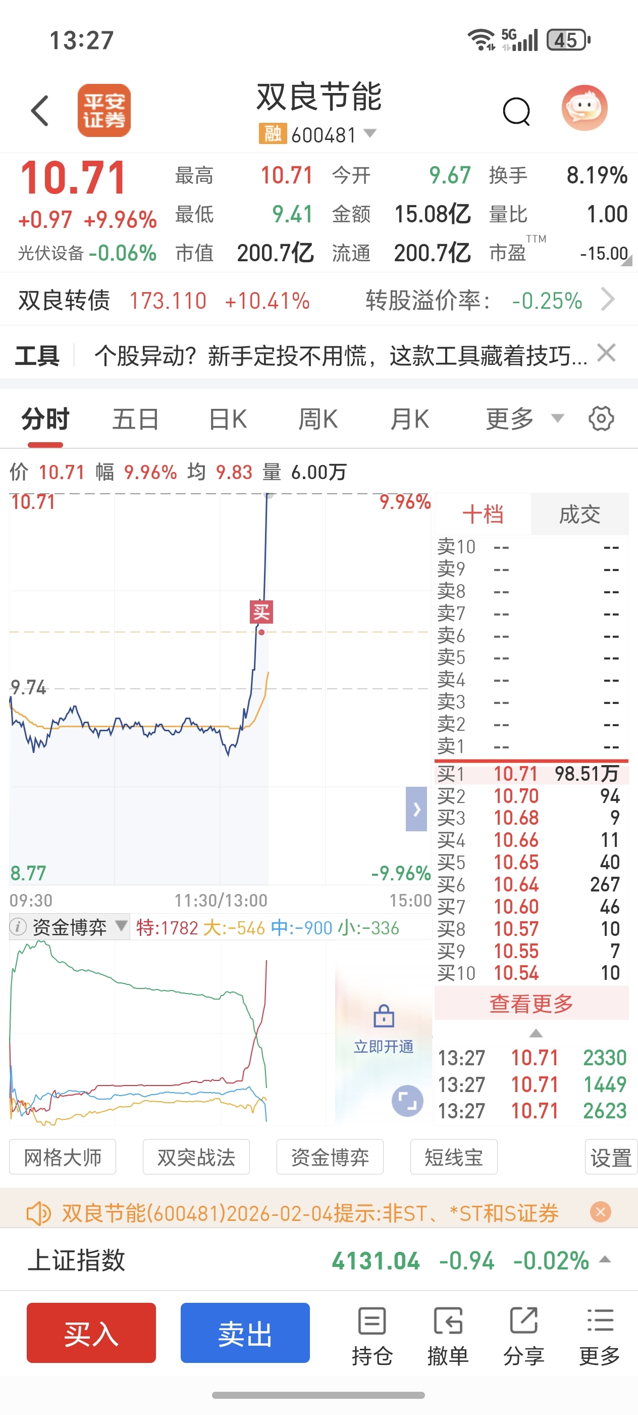 $双良节能(SH600481)$ 我这拼手速买在高位了,明天能不能吃大面啊,尾盘拉升的哎心痛