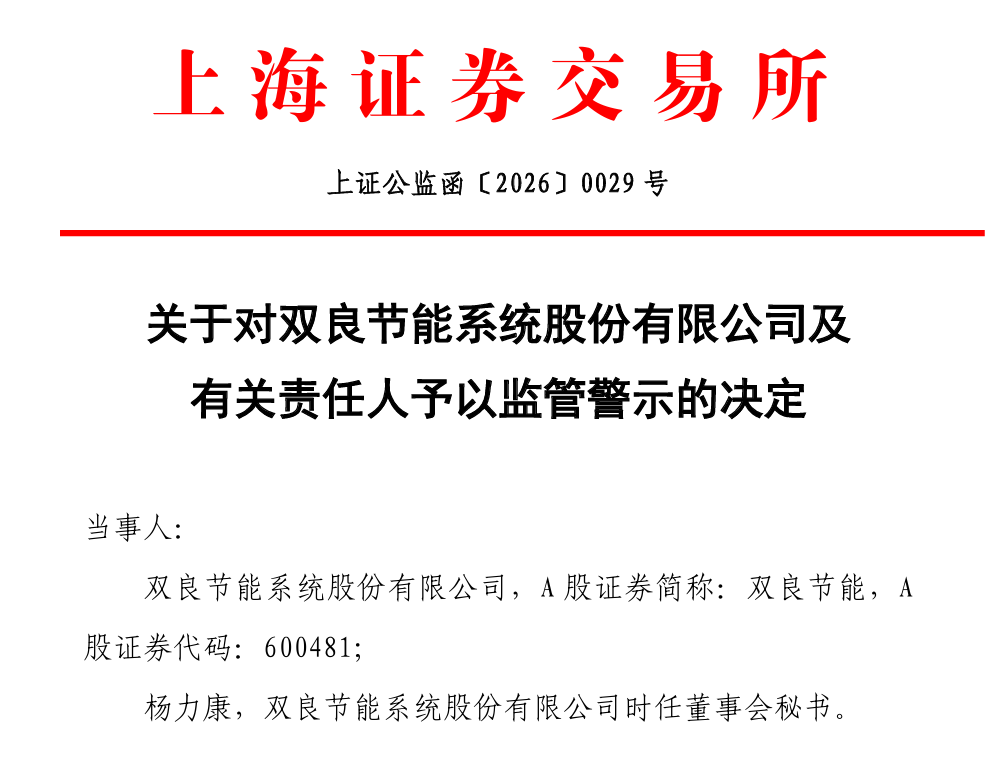 2月12日晚间,上交所发布《关于对双良节能系统股份有限公司及有关责任人予以监管警示的决定》。