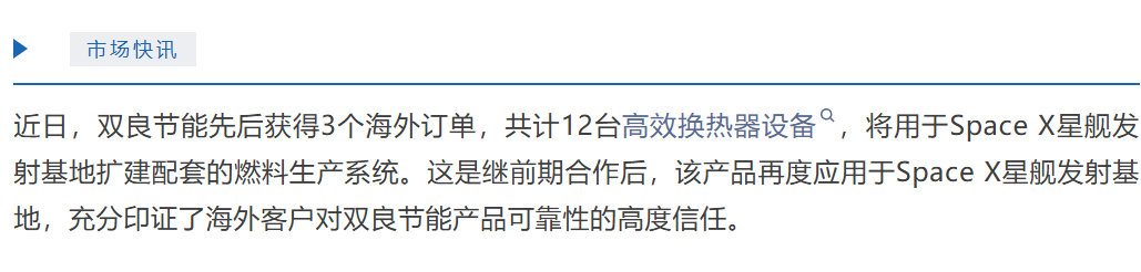 双良节能称,近日公司先后获得3个海外订单,共计12台高效换热器设备,将用于SpaceX星舰发射基地扩建配套的燃料生产系统。这是继前期合作后,该产品再度应用于SpaceX星舰发射基地,充分印证了海外客户对双良节能产品可靠性的高度信任。