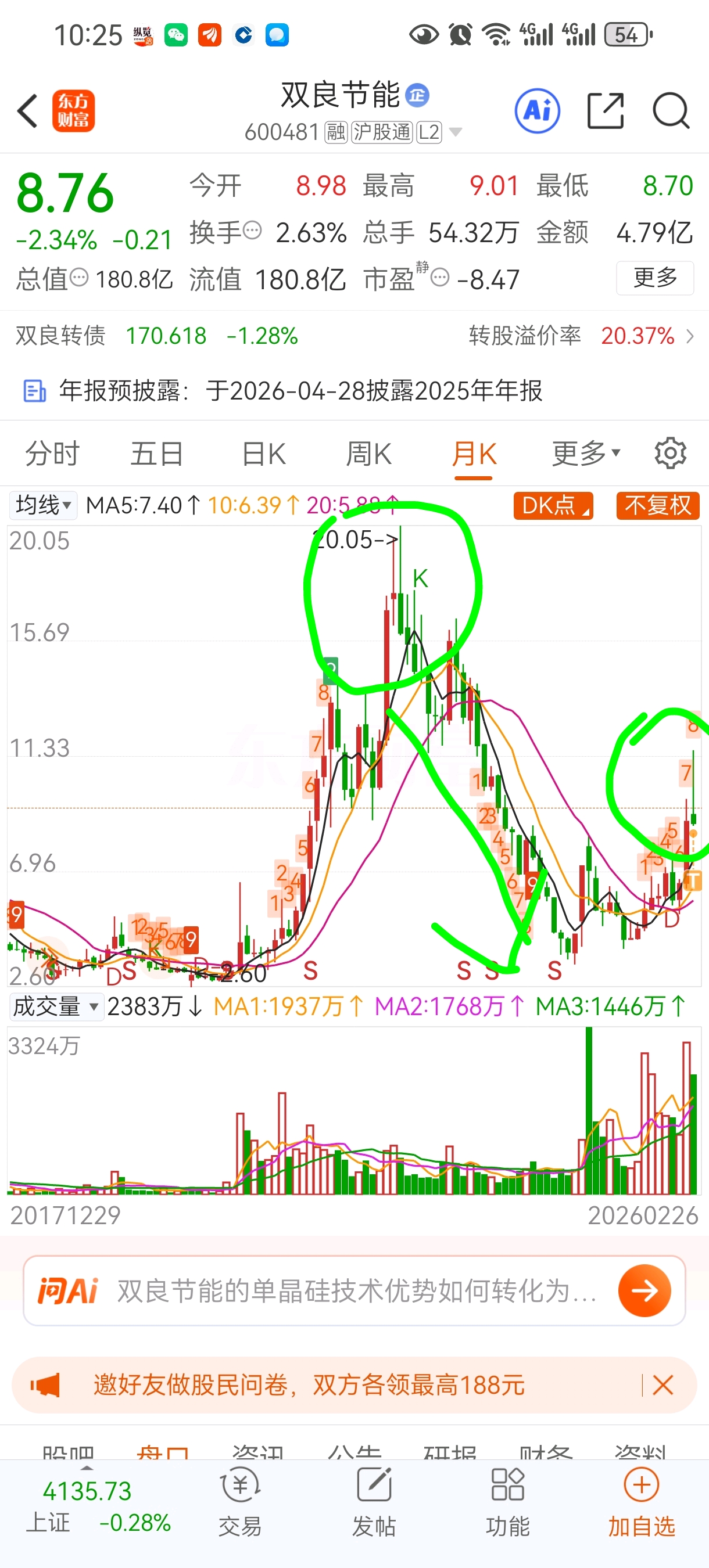$双良节能(SH600481)$ 投资失败 被套了 这股上一个长上影月线跌了24个月才止跌 有点危险