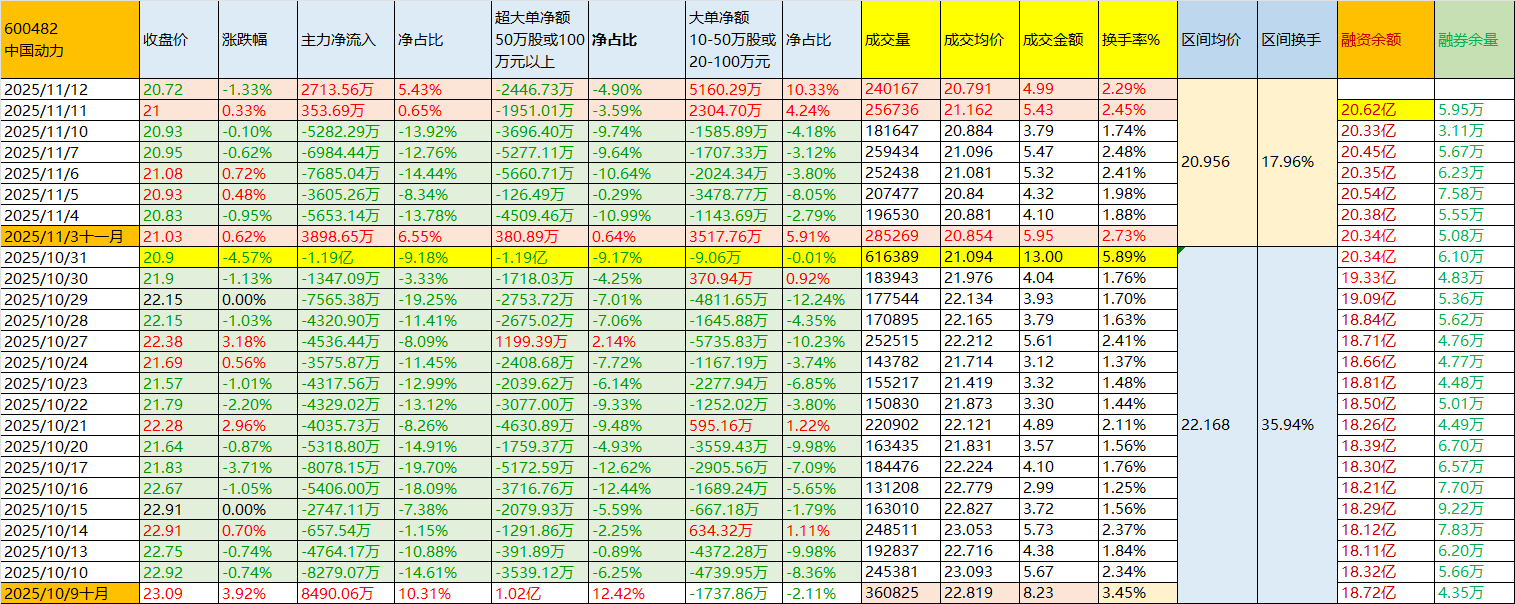 $中国动力(SH600482)$ 此前想卖的,基本已卖完;现在想买的,还是会买;11-11开盘异动,11-12主力资金净流入2713万元,已连续两日大单资金净流入7464万元(有资金承接);K线形态发出止跌信号,补涨行情随时展开,目标位先看20日、30日和60日均线。