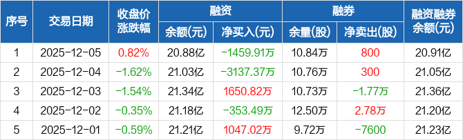 融资方面,当日融资买入4156.74万元,融资偿还5616.65万元,融资净偿还1459.91万元。融券方面,融券卖出3500股,融券偿还2700股,融券余量10.84万股,融券余额212.79万元。融资融券余额合计20.91亿元。