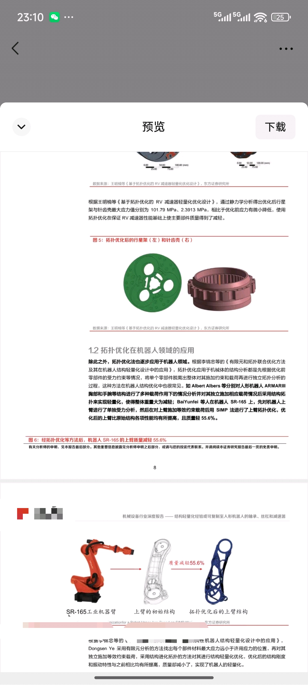 特斯拉OptimusGen2重量减轻10kg,人形机器人轻量化是必然趋势。2023年12月12日,特斯拉发布了第二代人形机器人擎天柱OptimusGen2,重量减轻10kg。轻量化发展有利于提升人形机器人的机动性、速度以及动作准确度和续航能力,是产业发展的必然趋势。 机器人的轻量化主要是从材料和结构这两个方面来实现。但基于材料的方法,需采用新型材料,如镁、铝合金和碳纤维复材等,其成本高且加工难度大,同时材料轻量化也需和结构设计相互耦合。与其相比,基于结构优化的方法只需改变结构形状,其成本低且容易实现,因而结构轻量化就成了机器人轻量化设计的主要方法。 结构优化法在汽车轴承、RV减速器、丝杠以及机器人等领域都有成功应用案例,可在性能不变或提升的情况下大幅减轻质量。结构优化方法分为尺寸优化,形状优化和拓扑优化3种。根据相关文献,经过拓扑优化后的汽车K57G0后传动轴质量可减轻10%;经过拓扑优化后,RV减速器性能保持的情况下其主要部件质量有所减轻;经结构优化后,近满载航天伺服反向式行星滚柱丝杠副IPRSM相较于具有同等应用载荷的国外IPRSM,体积和重量减小约30%,同时具有更高的传动效率和传动精度,综合性能优异。此外,结构优化法在机器人机械上臂、六轴机器人、机器人大腿等领域亦有成功应用案例。BaiYunfei等人对机器人SR-165的上臂实施了拓扑优化,优化后的上臂比原始结构各项性能均有所提高,且质量轻55.6%。吕鑫等从材料和结构两方面对六轴机器人进行轻量化设计,成功将质量减轻26.5%。王权等使用变密度法优化了WABIAN-2R机器人的大腿结构,在强度、刚度、固有频率不变的情况下移除了48.5%的材料。葛海波等用衍生式设计方法完全改变机器人腿部支架形状,将机器人腿部支架减轻了超过50%。 我们认为结构轻量化的成功经验或可复制到人形机器人领域,主要是由于当前人形机器人产业处在早期阶段,对应的设计方案在不断地更新迭代,其中也包含对轴承、丝杠、减速器类产品的优化升级。以特斯拉人形机器人为例,其包含了14个旋转执行器和14个线性执行器,即56个轴承类产品(14个角接触球轴承+14个交叉滚子轴承+14个滚珠轴承+14个四点接触轴承)、14个行星滚柱丝杠和14个谐波减速器,假设旋转执行器和线性执行器相应的总质量减轻10%、20%、30%、40%、50%,则人形机器人单机可减轻3.8、7.7、11.5、15.3、19.1千克。 投资建议与投资标的 机器人轻量化后可大幅提高运动的机动性和工作效率,进而改善操作速度和动作准确度,同时减轻运动惯性,提高机器人的本质安全性。因此,轻量化后的人形机器人效率会更高,对控制或关节的要求可能会下降,所需的执行功能的难度也可能会降低,这有利于推动量产节点的提前和降低大规模量产的门槛。我们认为全球包括中国的优秀制造业企业积累了深厚的结构轻量化的成功经验,或将之复制到人形机器人领域,建议关注产业链相关公司:1)丝杠和轴承:五洲新春(603667,买入)、北特科技(603009,未评级)、恒立液压(601100,未评级)、贝斯特(300580,未评级)、秦川机床(000837,未评级)、鼎智科技(873593,未评级)、禾川科技(688320,未评级)、新坐标(603040,未评级)、金沃股份(300984,未评级)等;2)减速器:绿的谐波(688017,未评级)、夏厦精密(001306,未评级)、中大力德(002896,未评级)、秦川机床(000837,未评级)、丰立智能(301368,未评级)、昊志机电(300503,未评级)、国茂股份(603915,未评级)、双环传动(002472,未评级)、豪能股份(603809,未评级)、精锻科技(300258,买入)、汉宇集团(300403,未评级)等。 风险提示:人形机器人进展不及预期;轻量化进展不及预期;国产替代进程不及预期;行业竞争加剧;假设条件变化影响测算结果。