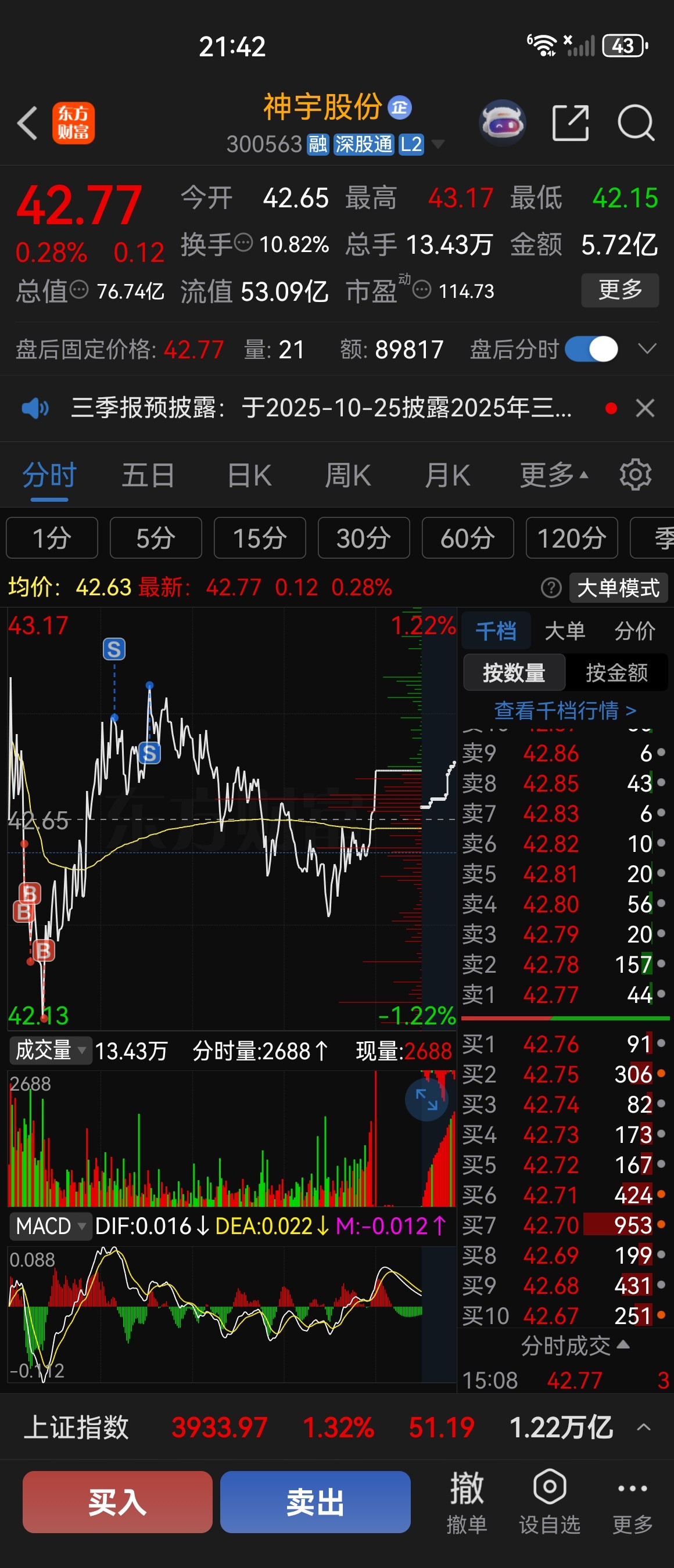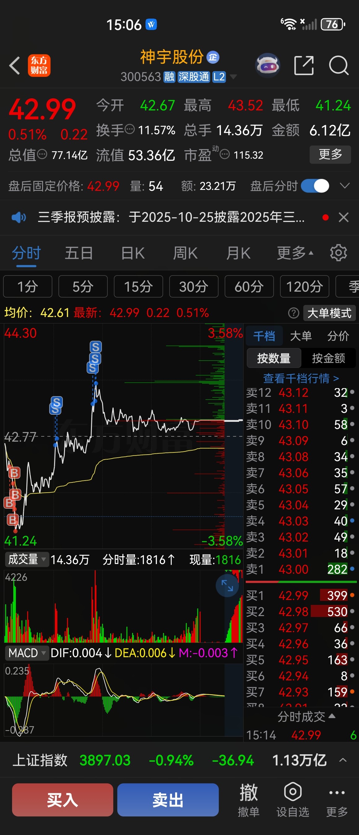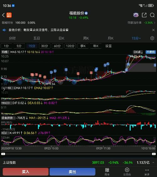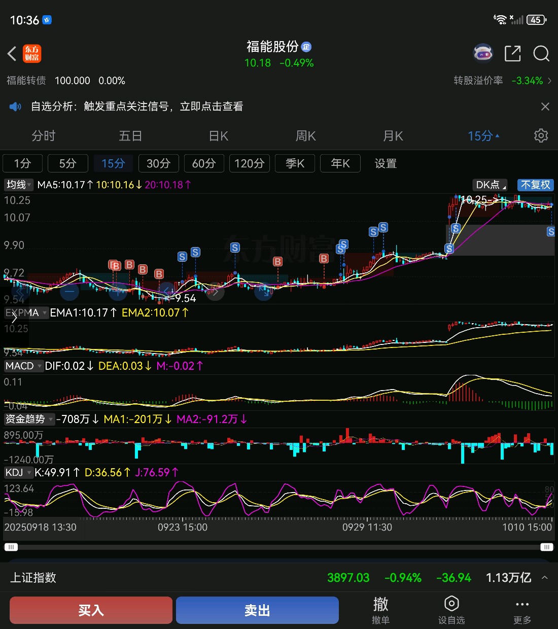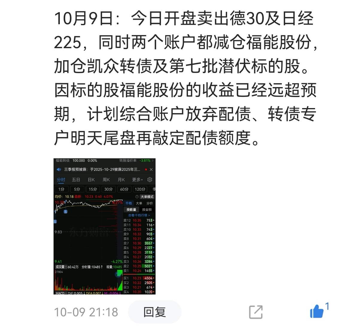 ——节前节后四个交易日最值得自我点赞的交易是:一是节前把德30和日经225Etf持仓提高到15%,9日开盘就清仓,同时减仓$福能股份(SH600483)$;二是10日综合账户清仓放弃$福能转债(SH110099)$配债,转债专户减仓只留零成本的34手配债50张;三是9日10日用减仓福能的资金做了两次T潜伏标的股$神宇股份(SZ300563)$;四是把港股通套利股的仓位也降到了5+%,确保了节后还有3—5%的收益。(上述的相关交易图在10月8日的帖子及评论中已发的在此帖不再重复发)。