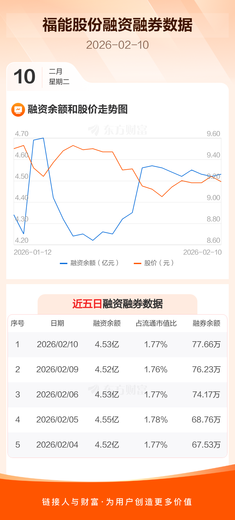 交易所最新数据显示,福能股份于2026年2月10日获融资买入914.89万元,融资偿还873.77万元,当日融资净买入41.12万元。目前,该股融资余额4.53亿,占流通市值比例为1.77%。