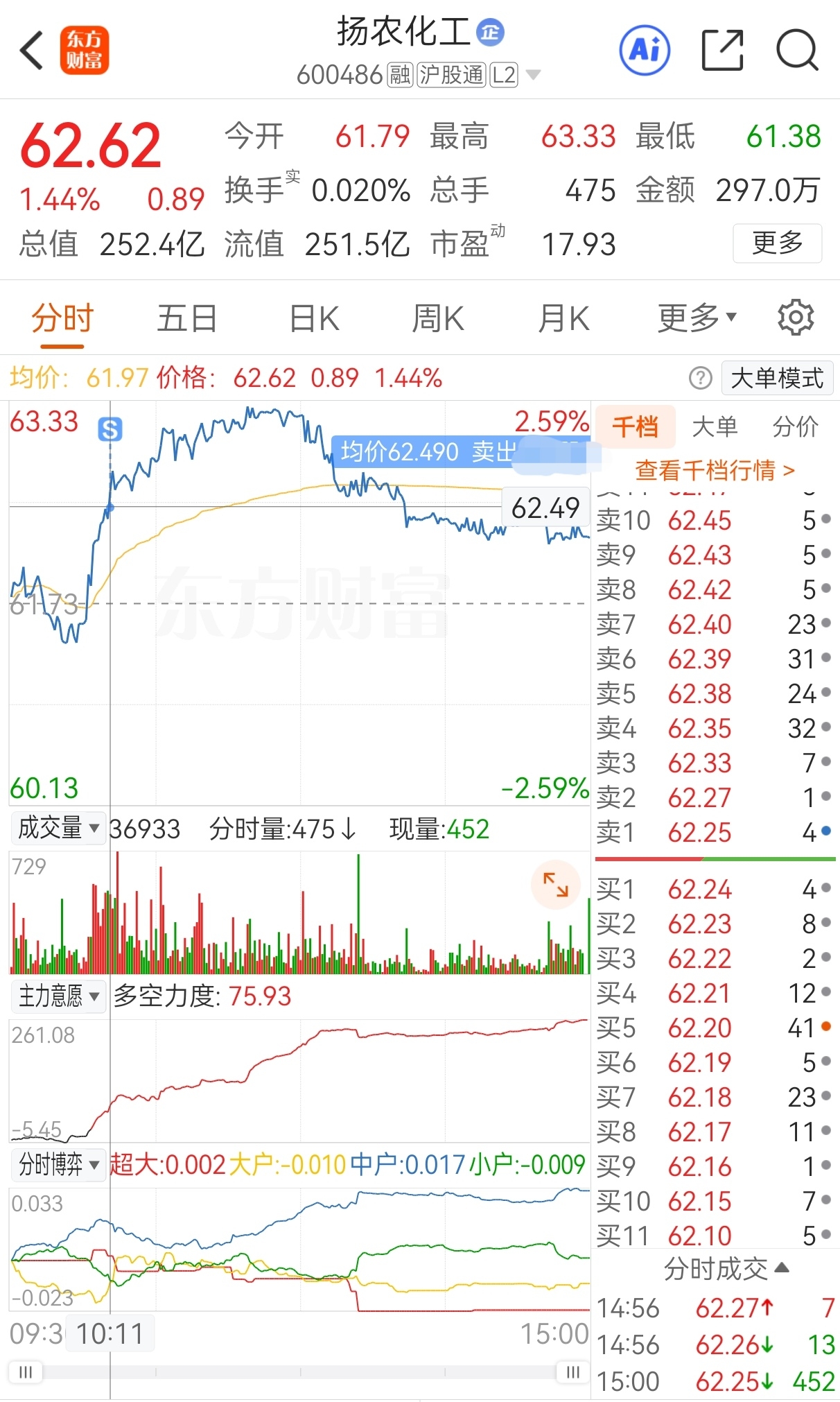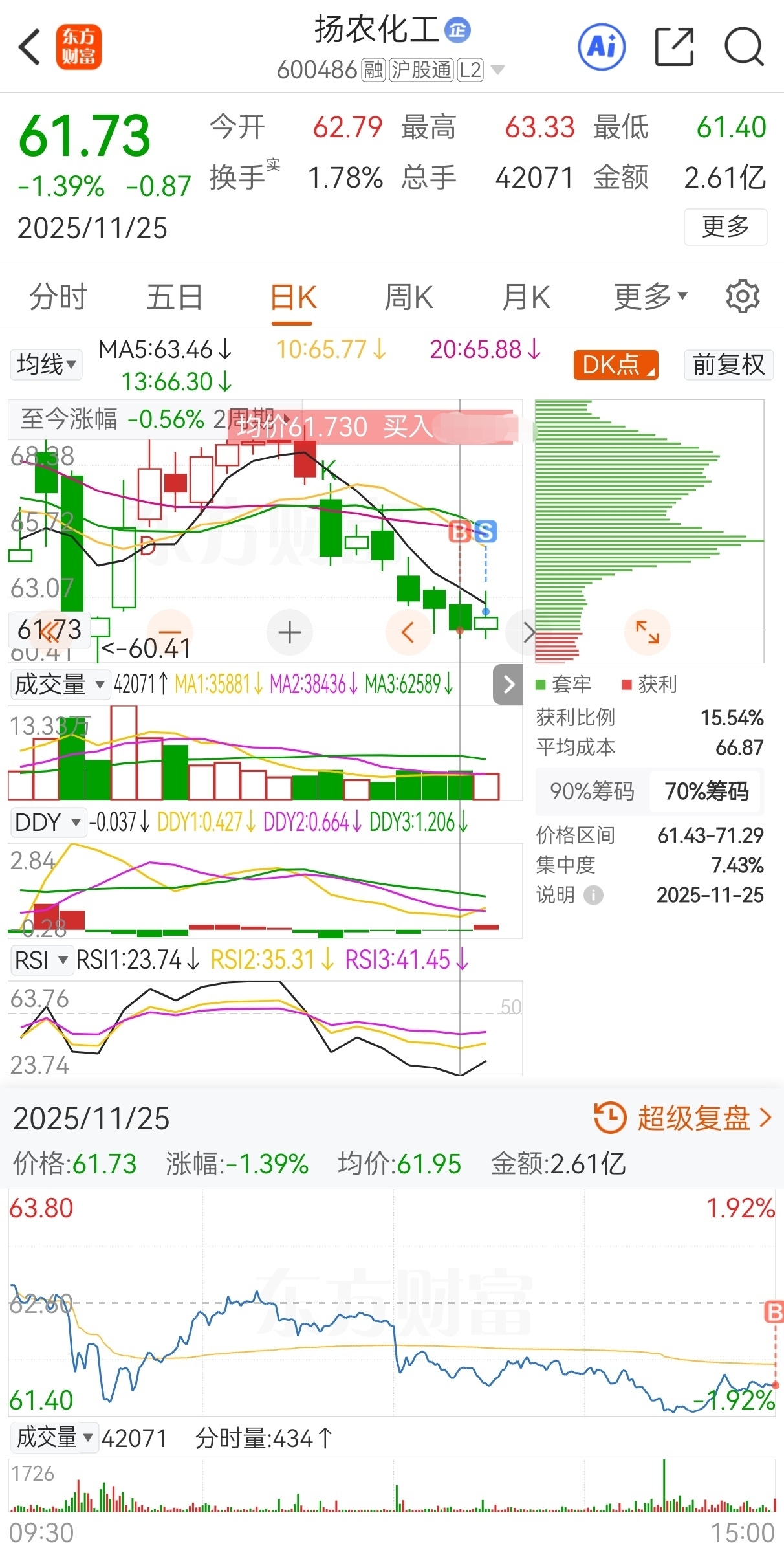 今买明卖,61.73买,62.49卖,实盘隔夜套利扬农化工,成功收米走人!