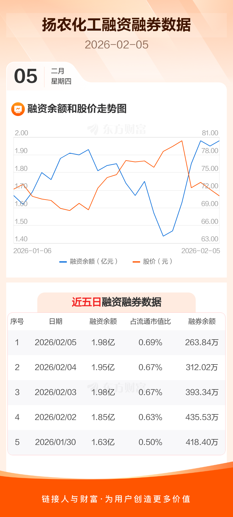 交易所最新数据显示,扬农化工于2026年2月5日获融资买入1502.07万元,融资偿还1138.43万元,当日融资净买入363.64万元。目前,该股融资余额1.98亿,占流通市值比例为0.69%。