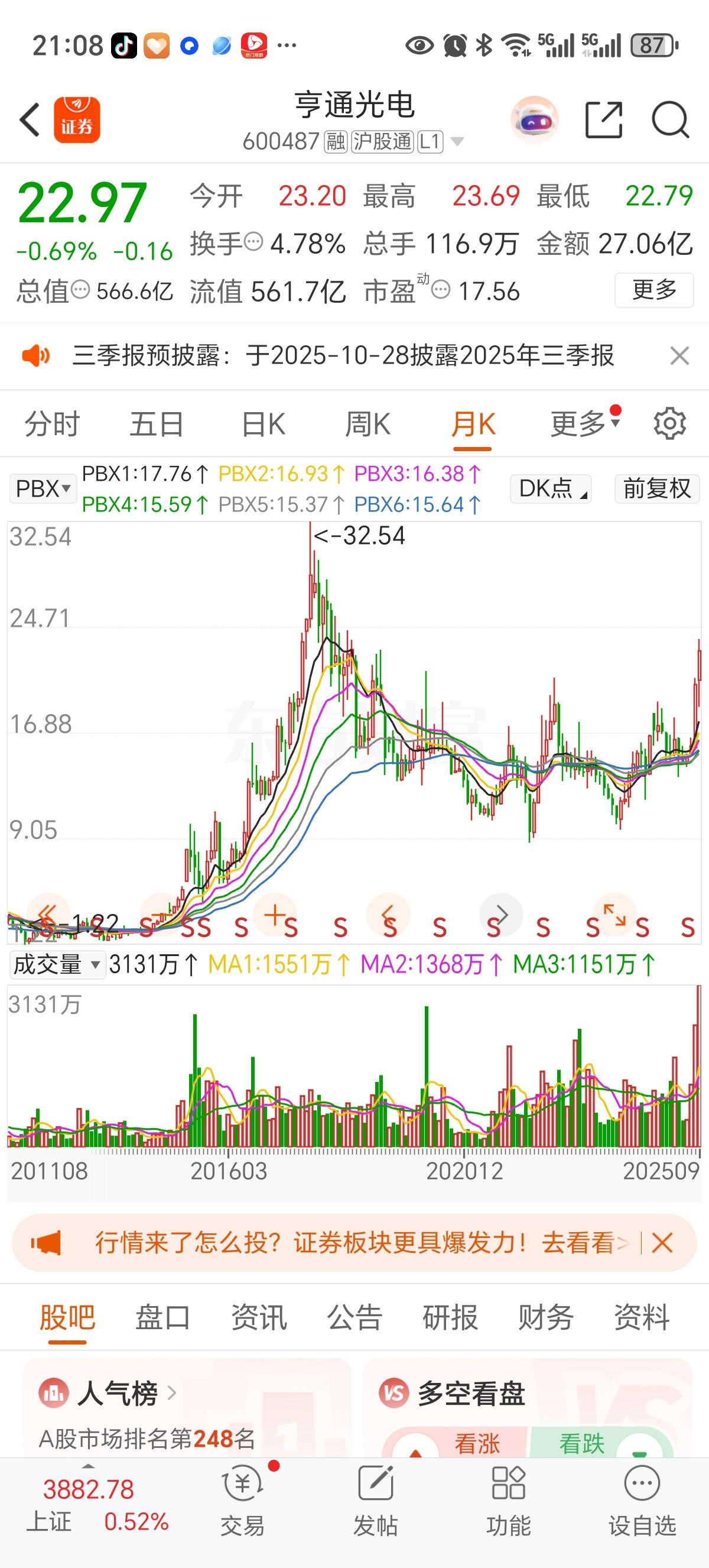 $亨通光电(SH600487)$ 月K线 瀑布线指标已经开始向上发散 成交量红柱已超过前期高点红柱高度 懂行的给分析分析这波行情是不是肯定会创新高 节后是不是要加仓干了