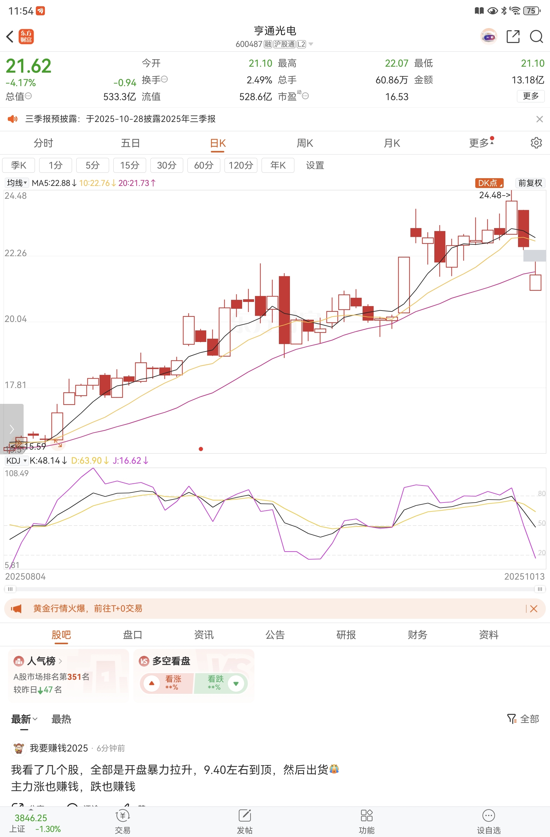 $亨通光电(SH600487)$ 短期调整没跑了,除非一根中阳线改变趋势