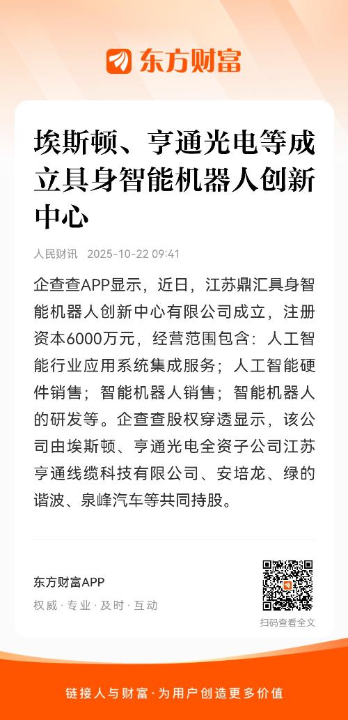 企查查APP显示,近日,江苏鼎汇具身智能机器人创新中心有限公司成立,注册资本6000万元,经营范围包含:人工智能行业应用系统集成服务;人工智能硬件销售;智能机器人销售;智能机器人的研发等。企查查股权穿透显示,该公司由埃斯顿、亨通光电全资子公司江苏亨通线缆科技有限公司、安培龙、绿的谐波、泉峰汽车等共同持股。