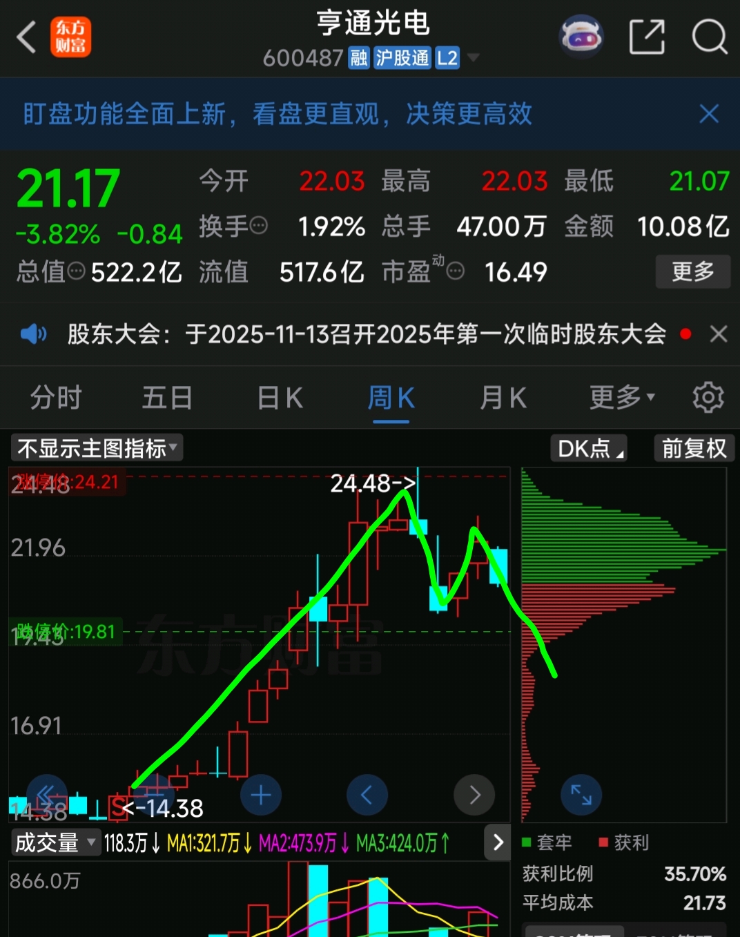 $亨通光电(SH600487)$ 周线次高,调整刚刚开始