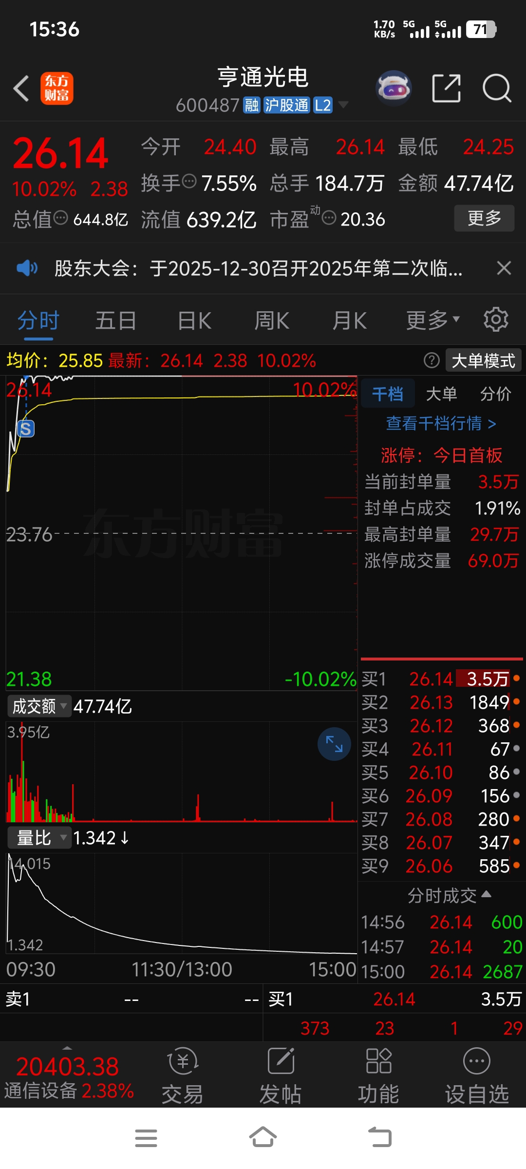 $亨通光电(SH600487)$ 走了,明天肯定要回调