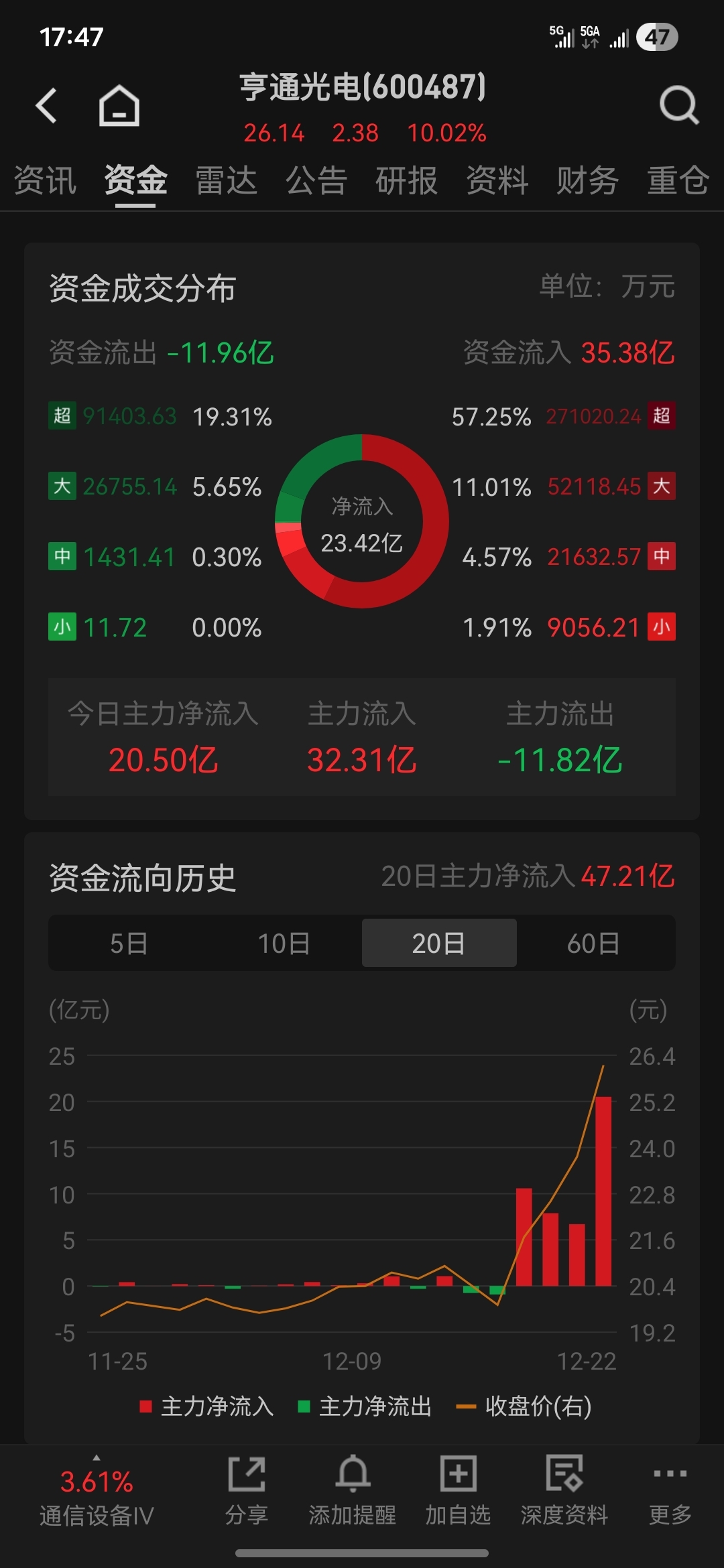 $亨通光电(SH600487)$ 趋势已成,无脑看多,万得的资金流入太夸张