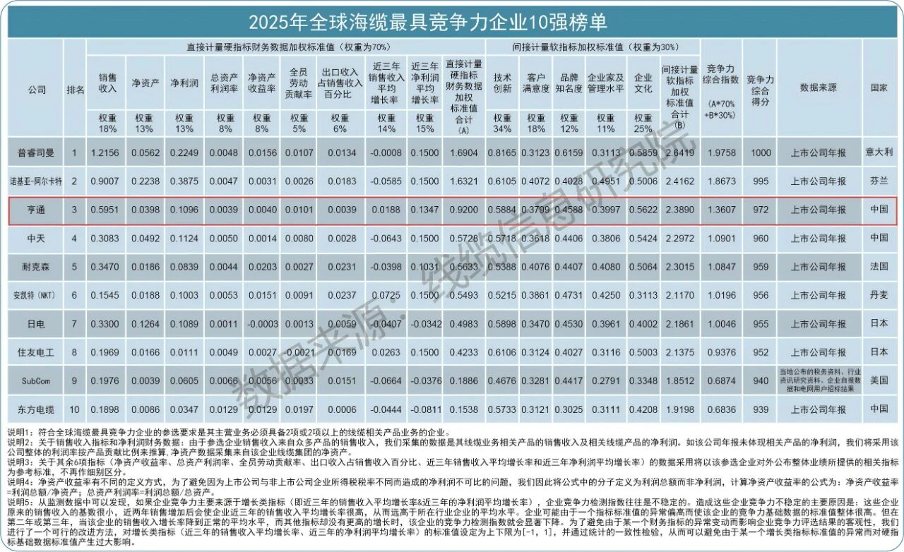 亨通荣获25年全球线缆/海缆最具竞争力企业10强第二/三位。