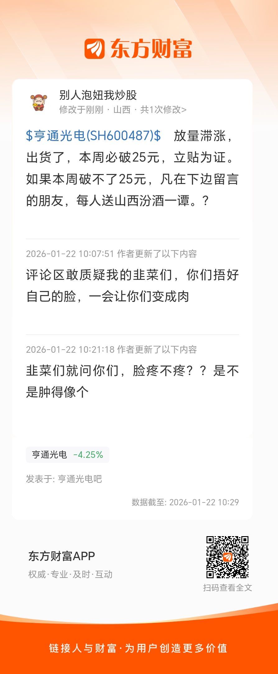 $亨通光电(SH600487)$ 放量滞涨,出货了,本周必破25元,立贴为证。如果本周破不了25元,凡在下边留言的朋友,每人送山西汾酒一谭。?