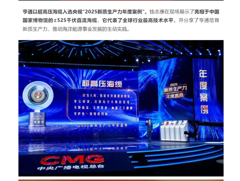 今晚央视播出:亨通超高压海缆入选央视“2025新质生产力年度案例”