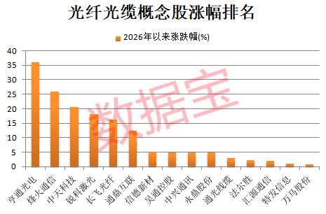 证券时报·数据宝统计,A股市场涉及光纤光缆行业的公司数量较少,合计不到20家。截至1月28日收盘,今年以来光纤光缆概念股平均上涨9.72%,跑赢同期上证指数5个百分点以上。6股累计涨幅超10%,分别为亨通光电、烽火通信、中天科技、锐科激光、长飞光纤、通鼎互联。