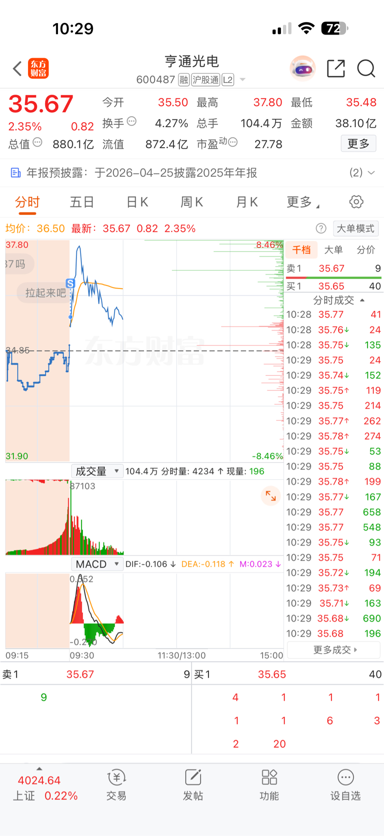 $亨通光电(SH600487)$ 没事,兄弟们给你们看个好玩的,这股不会套人,明天仍然会有高点,下次别冲高了