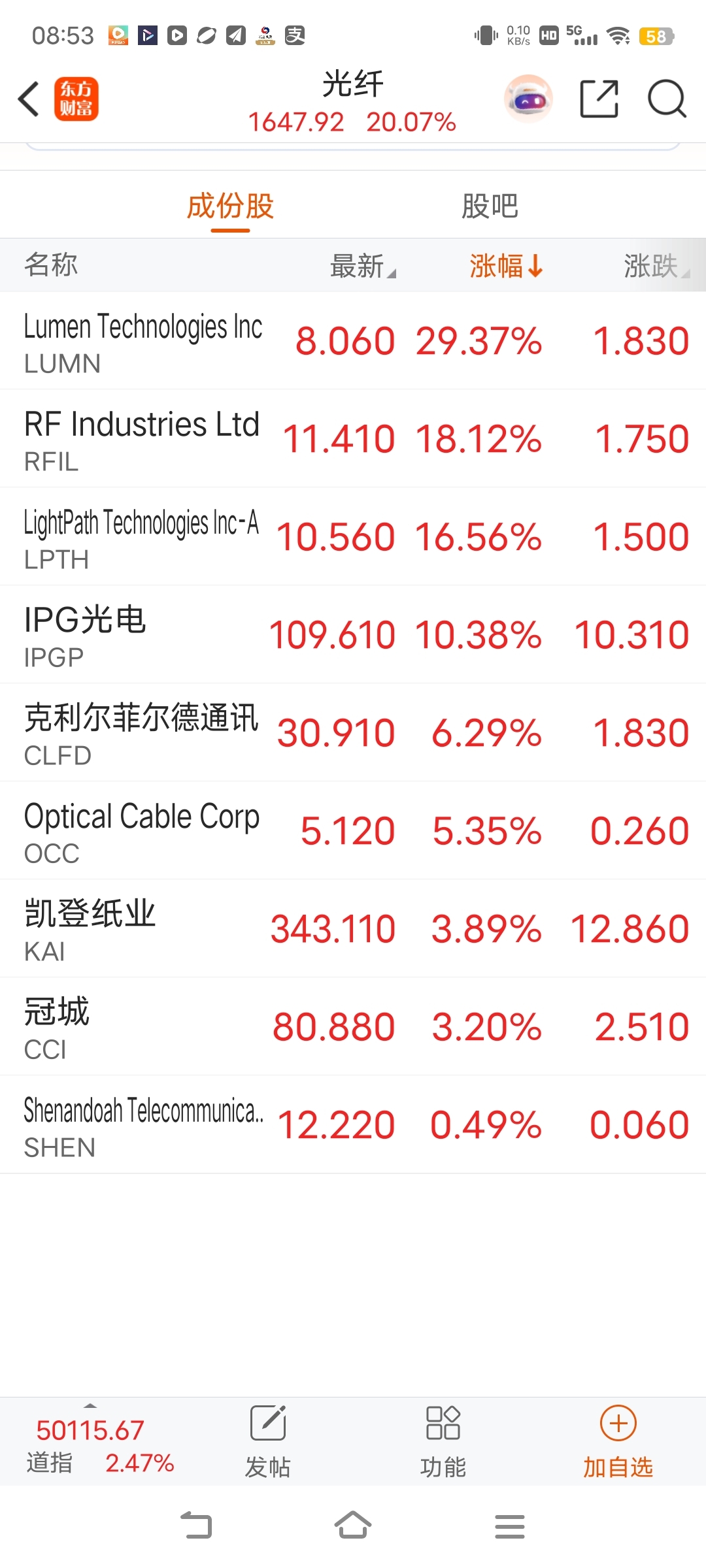 风了,美国光纤板块大涨百分之二十,周一一字板么。