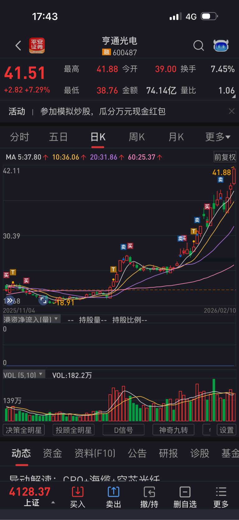 $亨通光电(SH600487)$ 那条线是5日均线,10年股民一点技术不会