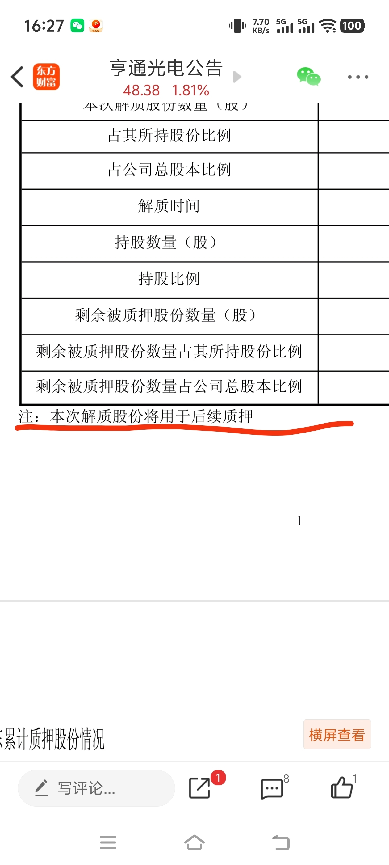 $亨通光电(SH600487)$ 抵押贷款到期了,相当于换据,先解除质压,再重新质押,不是利好。解除后公司质押率还有51%,质压率偏高