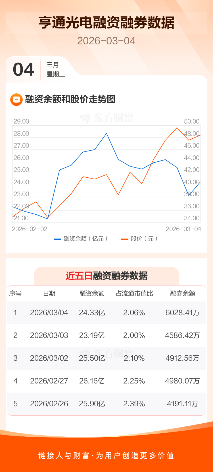 交易所最新数据显示,亨通光电于2026年3月4日获融资买入6.78亿元,融资偿还5.64亿元,当日融资净买入1.14亿元。目前,该股融资余额24.33亿,占流通市值比例为2.06%。