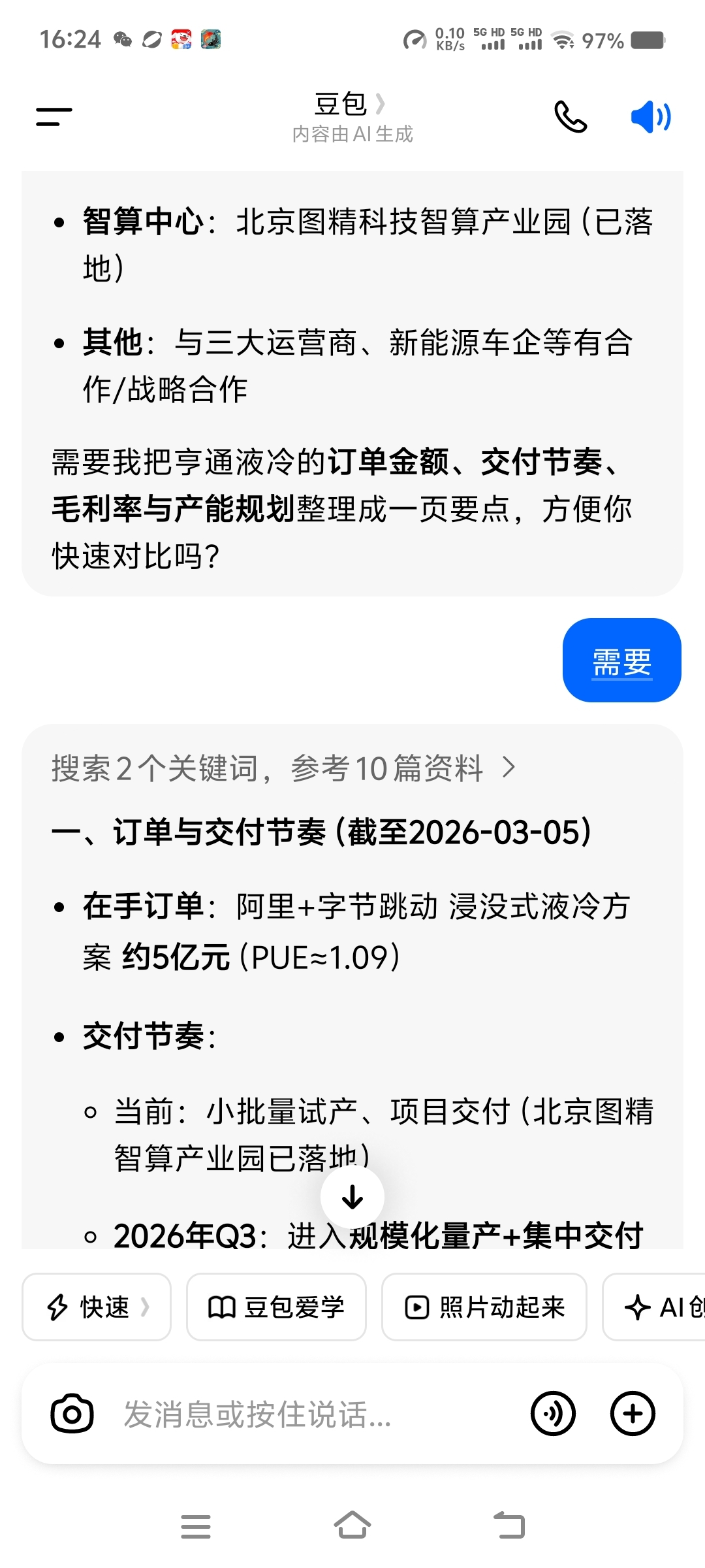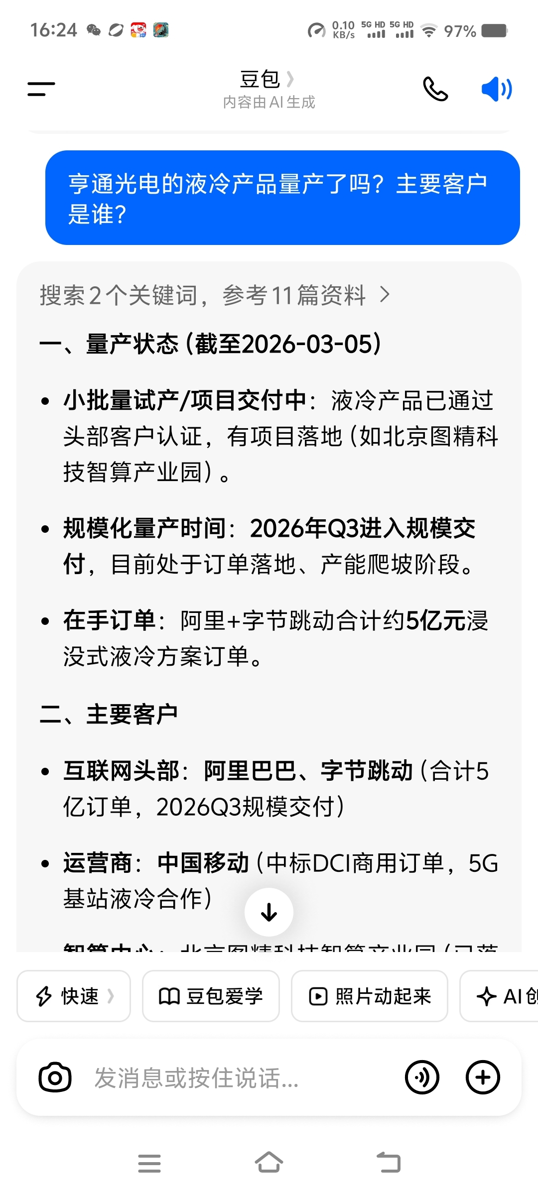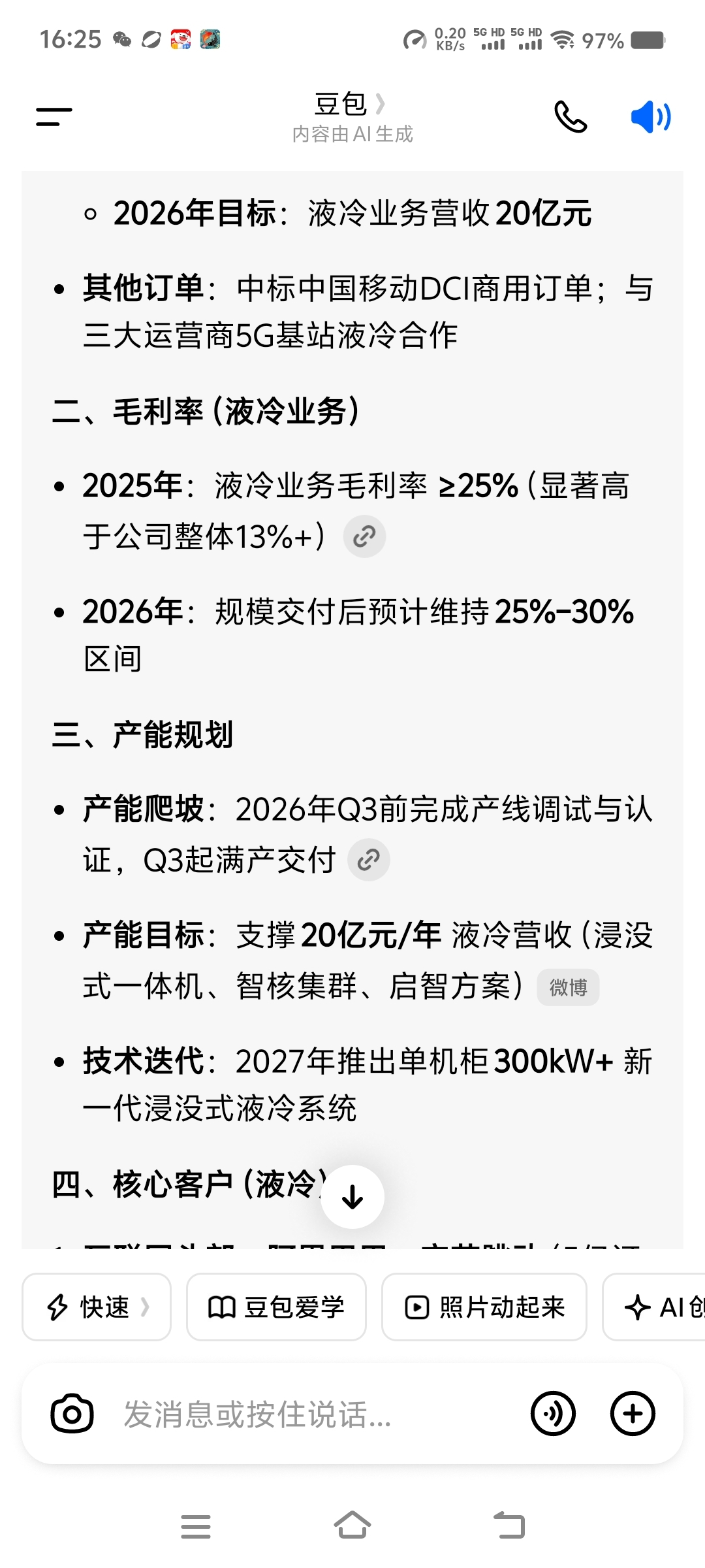 液冷产品已经量产,三季度交付,主要客户是阿巴阿巴和字节跳动