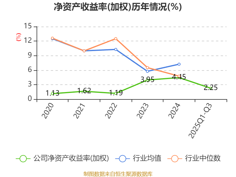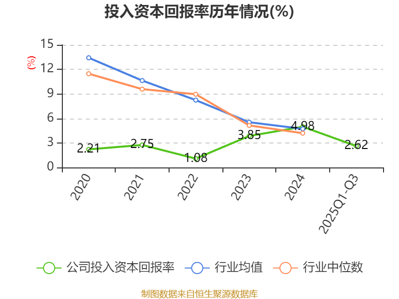 盈利能力方面, 2025年前三季度公司加权平均净资产收益率为2.25%,同比下降3.96个百分点。公司2025年前三季度投入资本回报率为2.62%,较上年同期下降2.83个百分点。