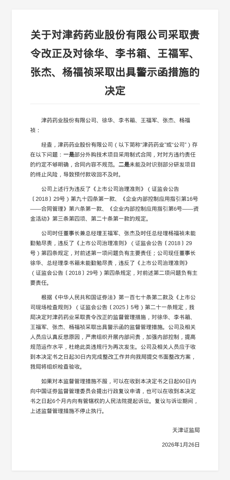 对此,天津证监局决定对津药药业采取责令改正的监督管理措施,对徐华、李书箱、王福军、张杰、杨福祯采取出具警示函的监督管理措施。
