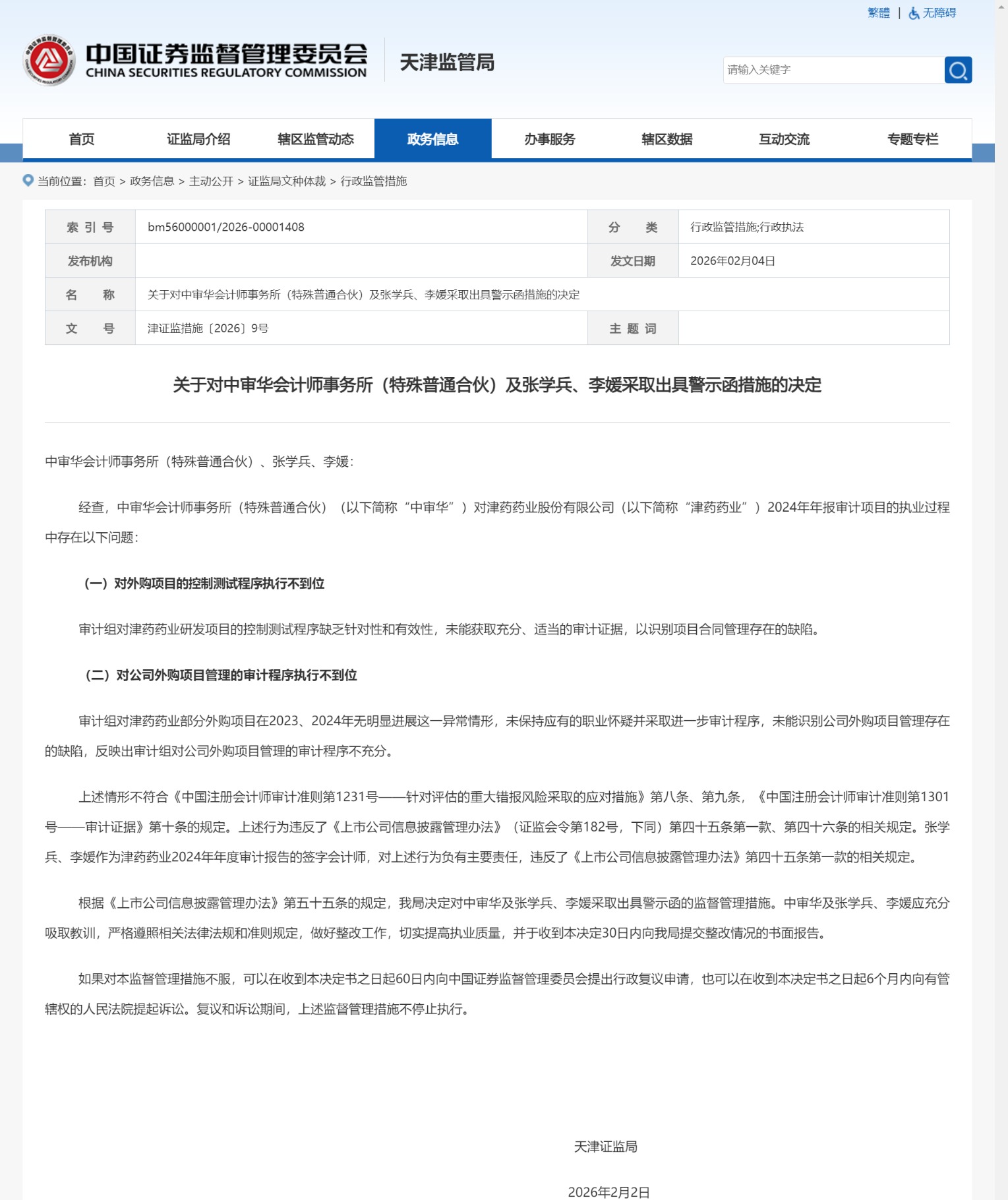天津证监局官网2月4日发布关于对中审华会计师事务所(特殊普通合伙)(以下简称“中审华”)及张学兵、李媛采取出具警示函措施的决定。