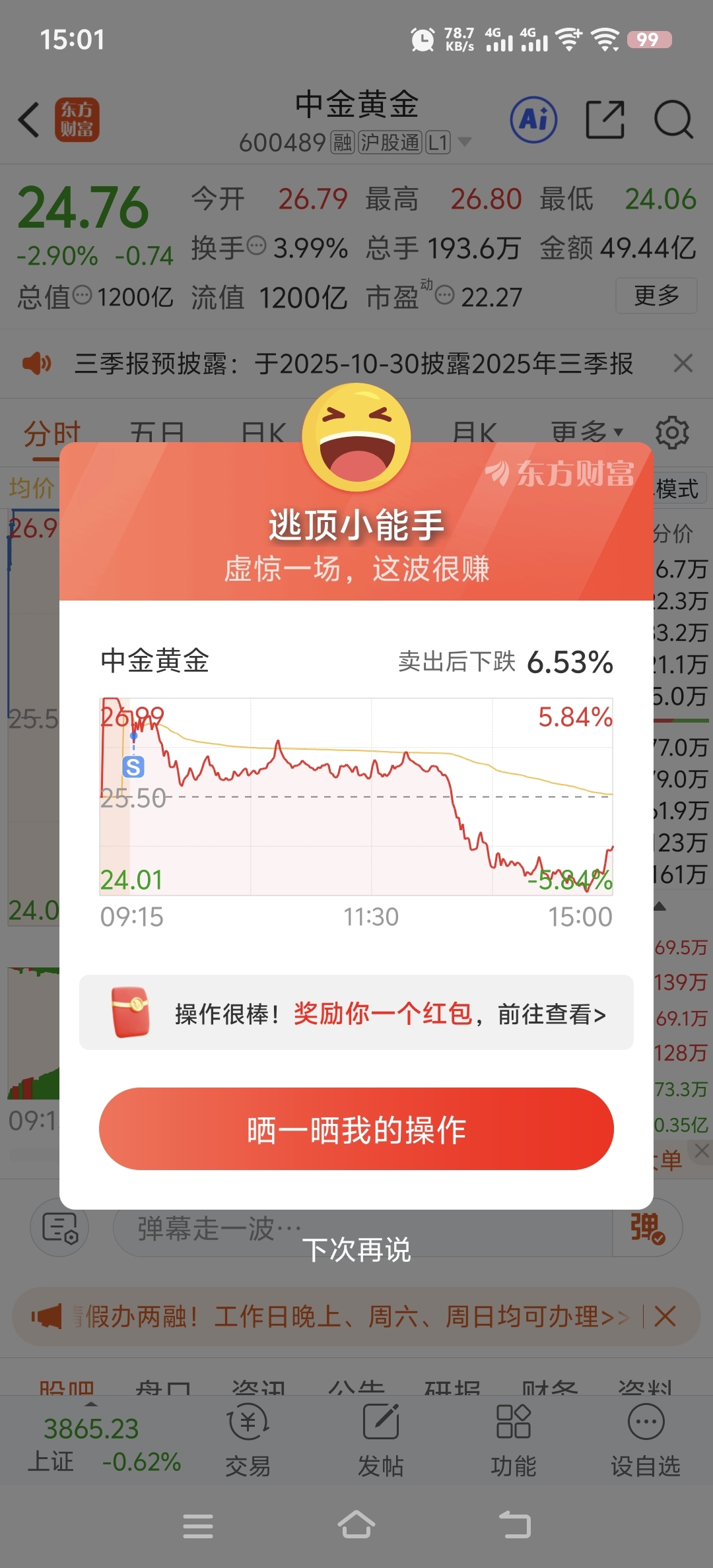 $中金黄金(SH600489)$ 赚点就走,不贪心,明天继续涨。我先撤退了