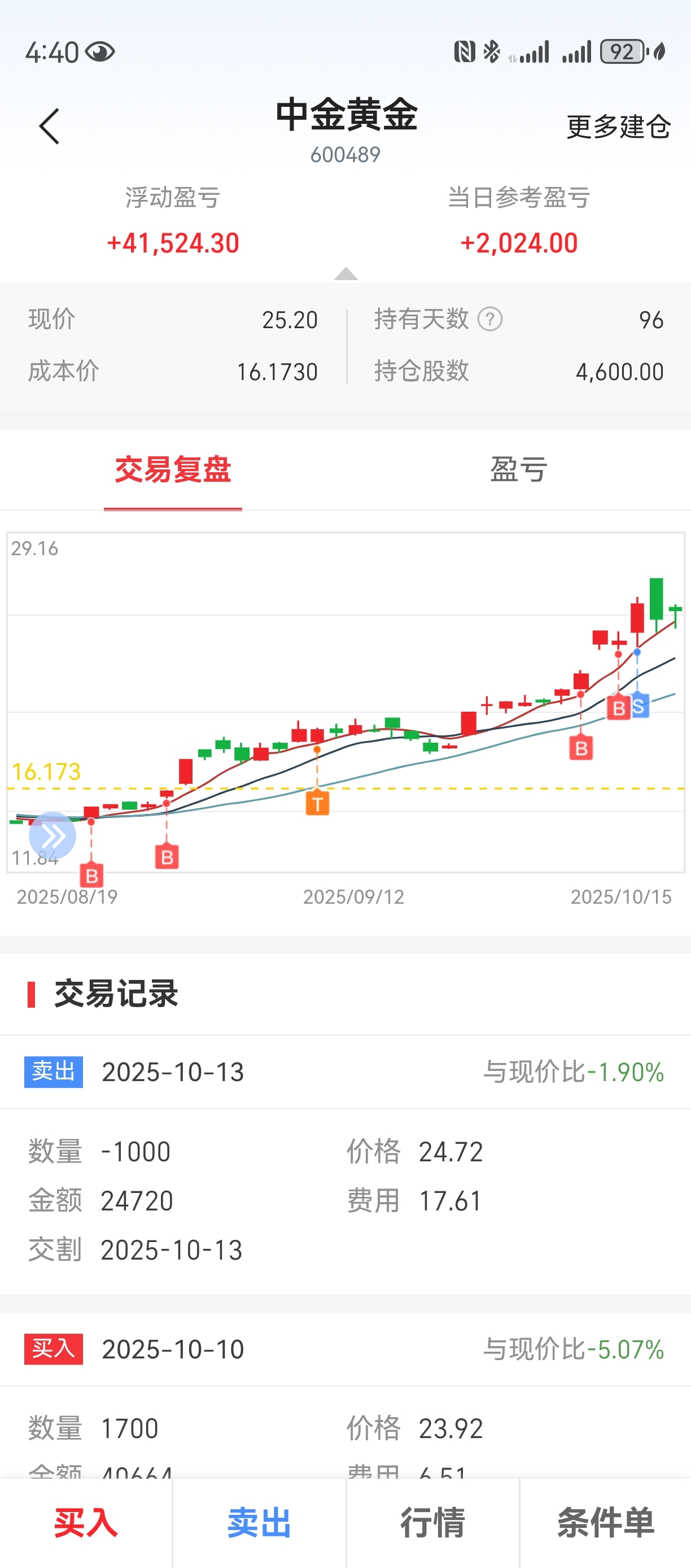 $中金黄金(SH600489)$ 微微T了一波 成本降了不少 再也不敢T了