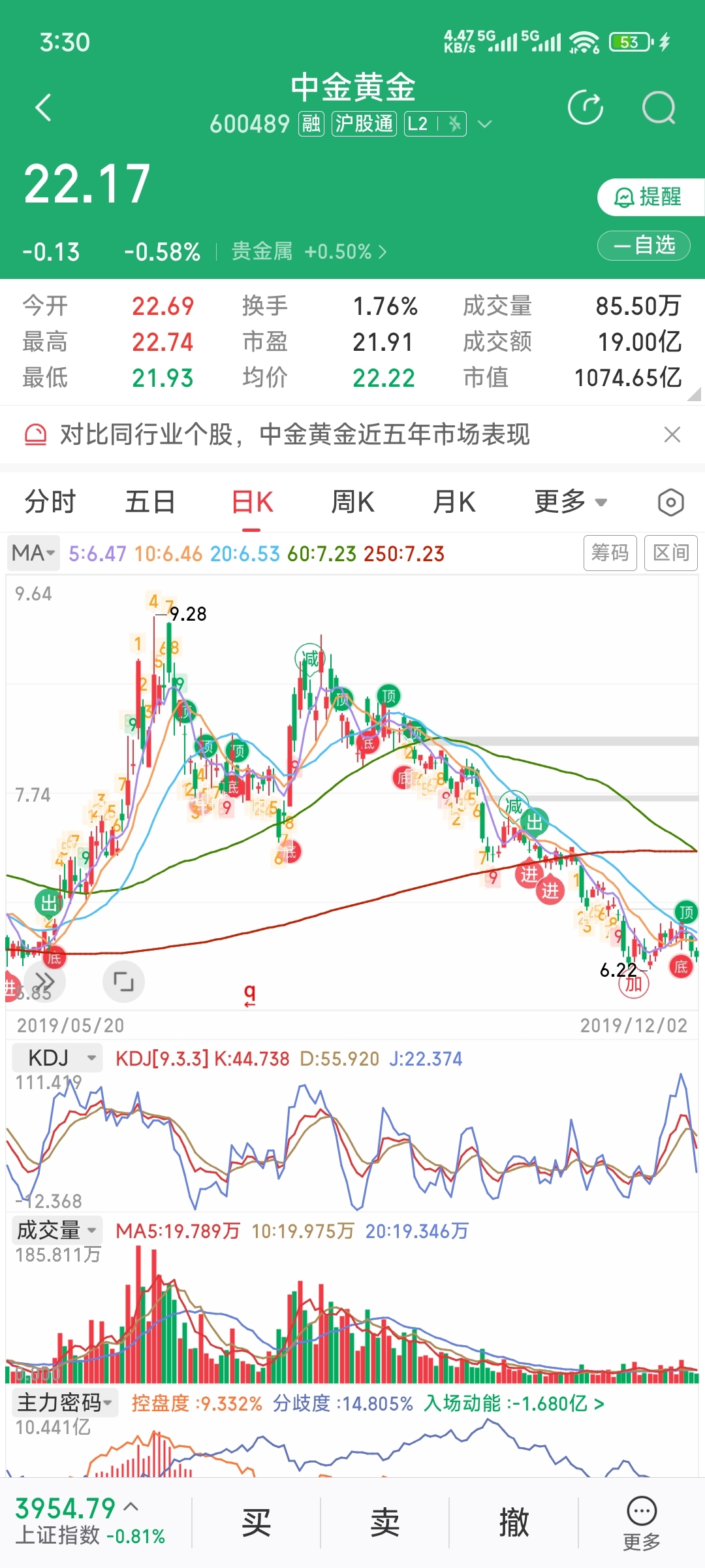 $中金黄金(SH600489)$ 2019-5月份的这个缺口像不像现在的?