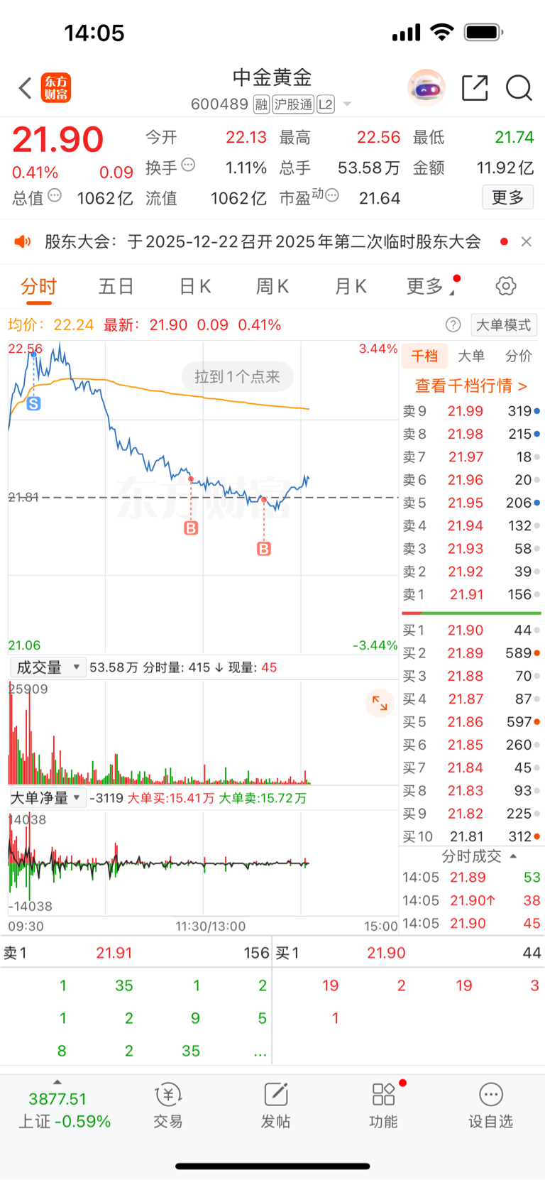 $中金黄金(SH600489)$ 今天T的很完美,快拉倒22.3,我要卖!