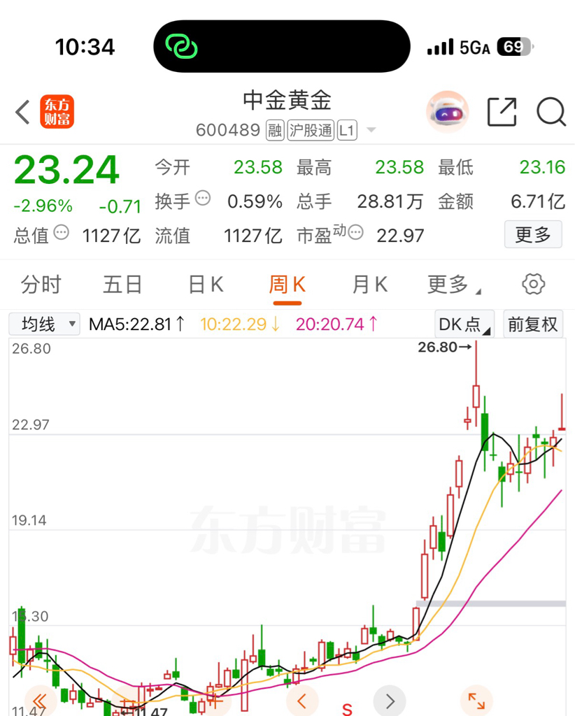 $中金黄金(SH600489)$ 周线大避雷针图形,起码调整一年