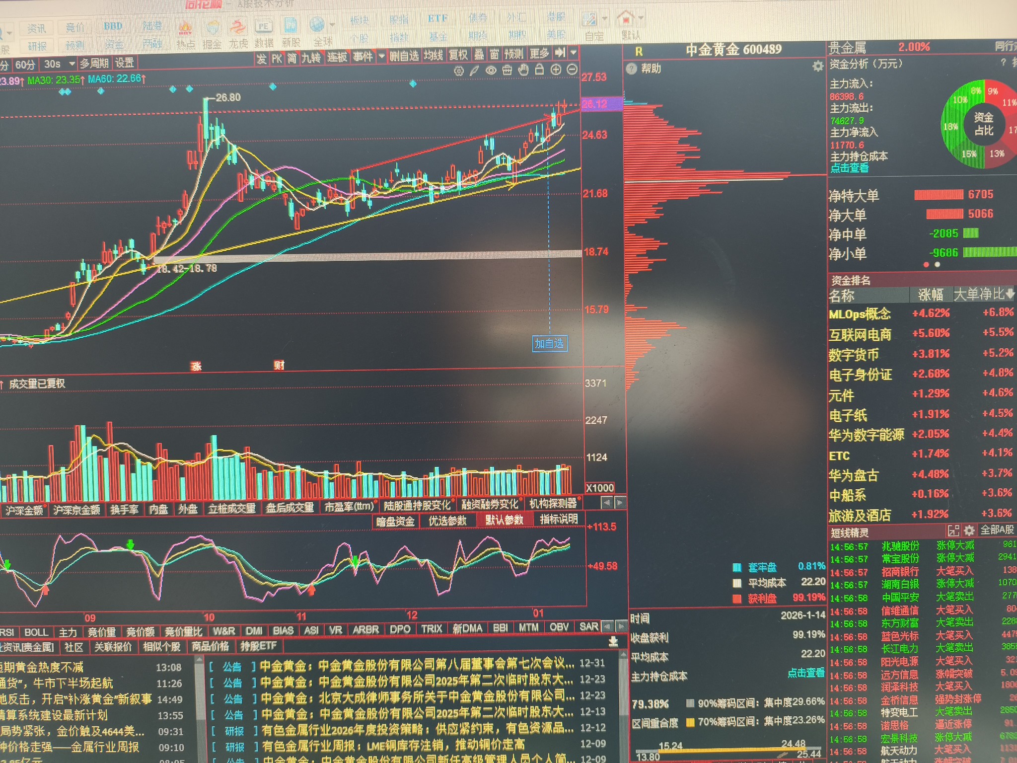 $中金黄金(SH600489)$ 中金黄金收盘新高的想法:1.K线用一段趋势消化前高后的下跌,这种形态创新高后大概率会有一波陡峭的拉升…待验证!2.隐忧:走的没有金子的幅度大,低估?溢价?大盘未来因素…???3.村里今天洒水降温或许利价值投资…4.中金黄金近期年报预告…?且走且看吧!