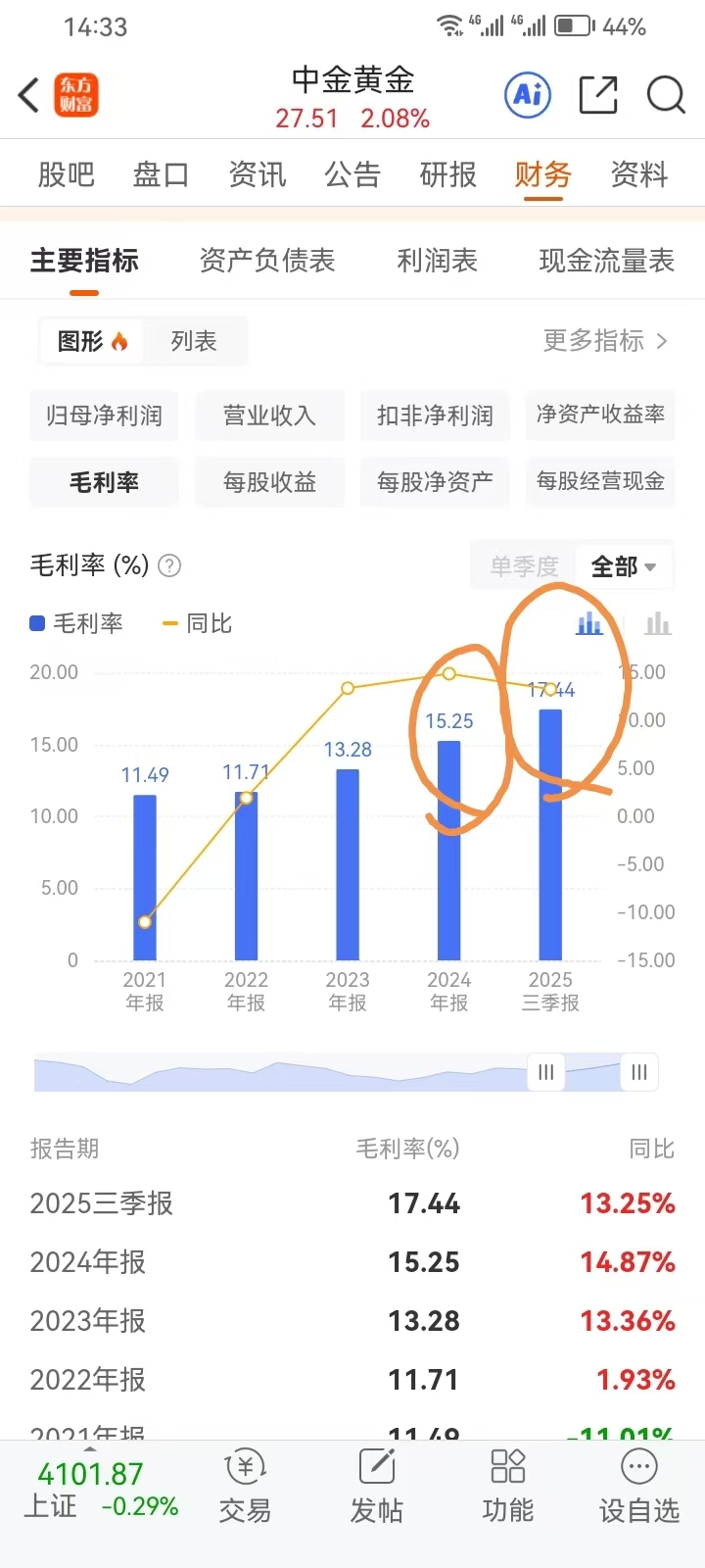 $中金黄金(SH600489)$ 请自行比较,挖同样的矿,基本一样的成本,销售的价格涨了30%,应该是纯利吧,就算扣掉五个点杂费,,24年黄金价格在2400美元,25年前3季度平均在3300美元,世界同步,而我们奇葩的中金黄金,销售毛利率,在24年是15%,在25年前三季度是17%