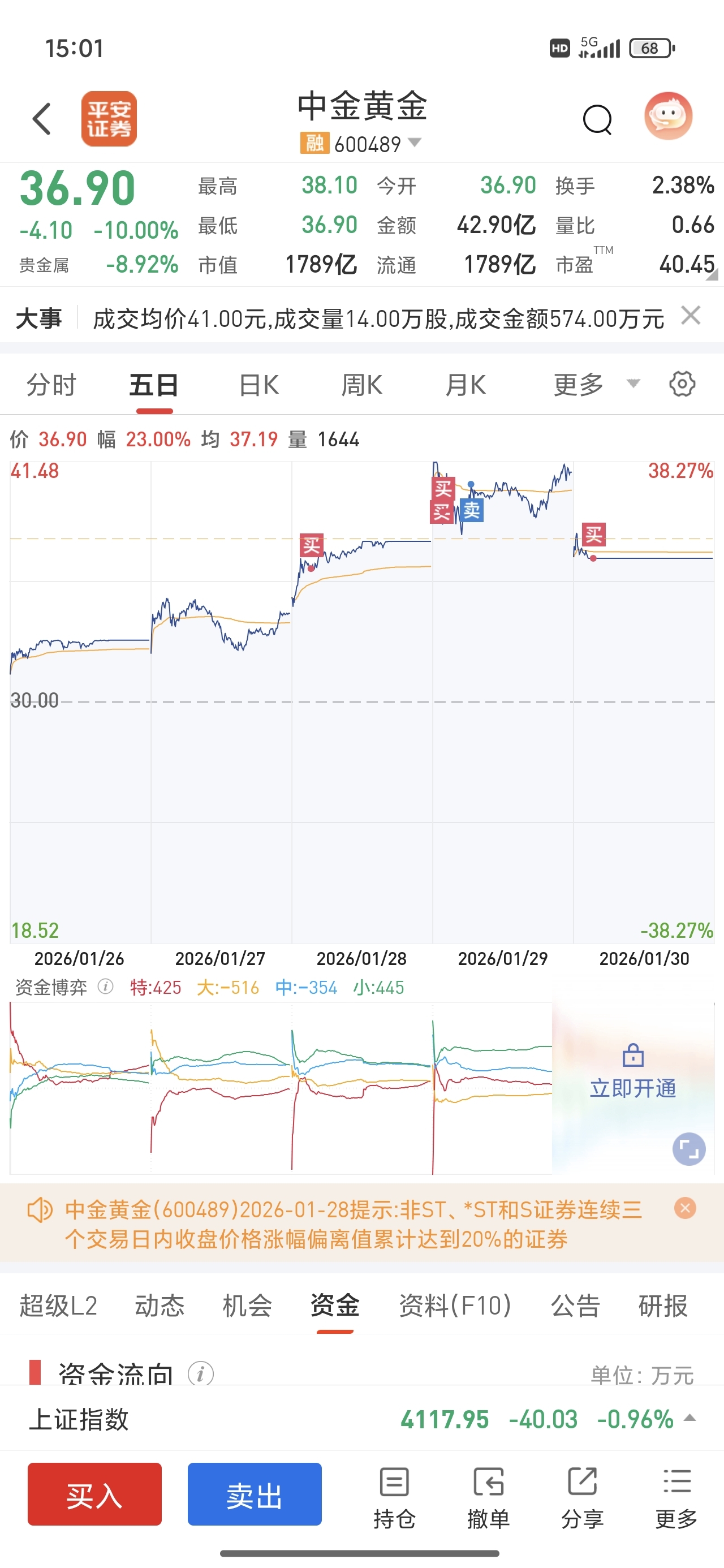 $中金黄金(SH600489)$ 周一要是封地板,就继续补仓,周二做个小T,周三做大T调仓,周四坐稳扶好,看到50,恐高就止盈。