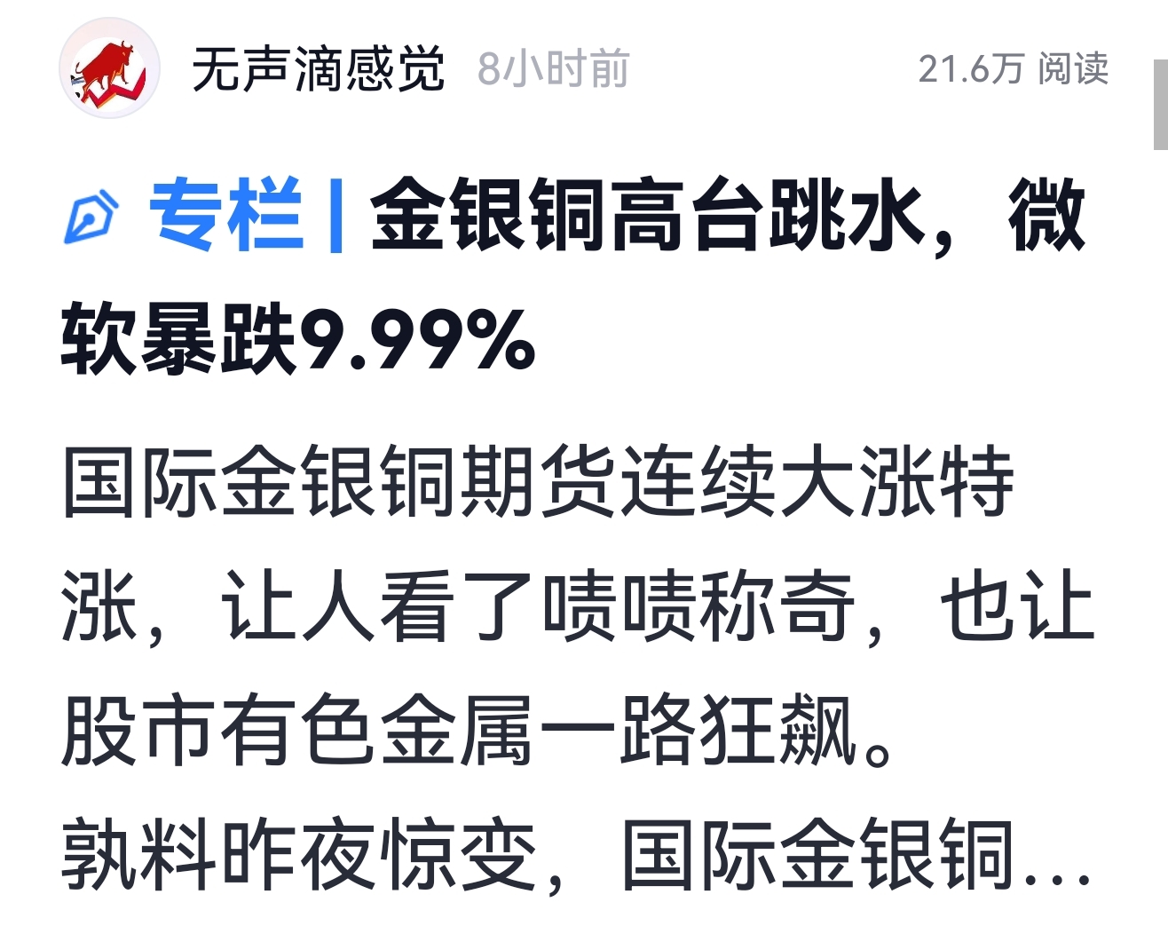 一大早六点多起床看了一下手机,昨夜金银铜期货跳水,虽然收复了一部分,但我心里感觉非常不妙,所以发了一篇文章《金银铜高台跳水,微软暴跌9.99%》,文中用高度概括的用词,讲期货会是“乐极生悲、盛极而衰、物极必反”。