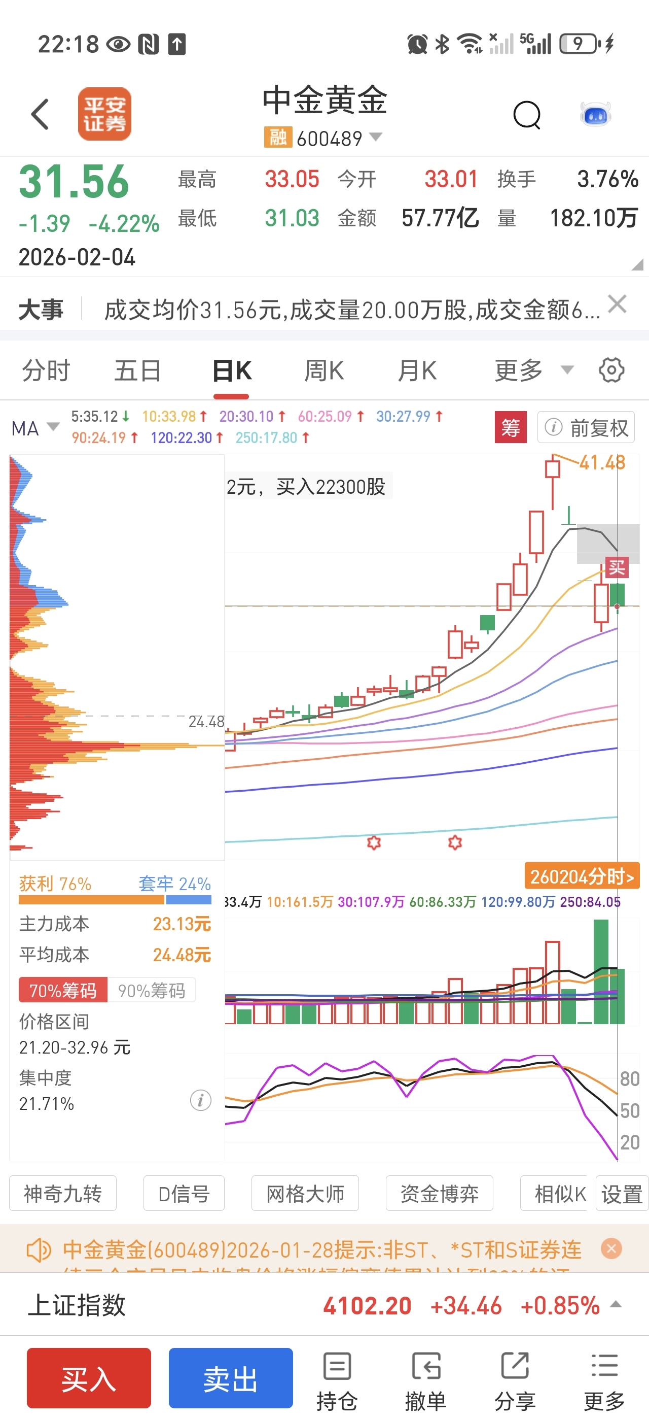 $中金黄金(SH600489)$ 看样子有些人是真急了,前天割肉离场,结果反弹了,黄金价格昨天再度守住5000美元,国内守住1100,这些人开始急了,各种烂帖忽悠别人割肉,你们看看这种筹码峰,主力就没走,套牢盘在哪?