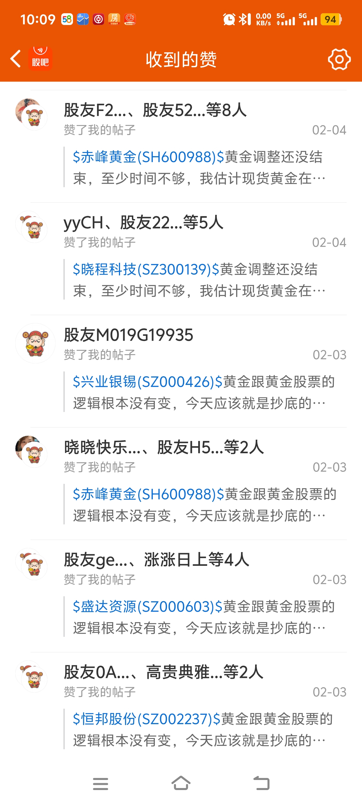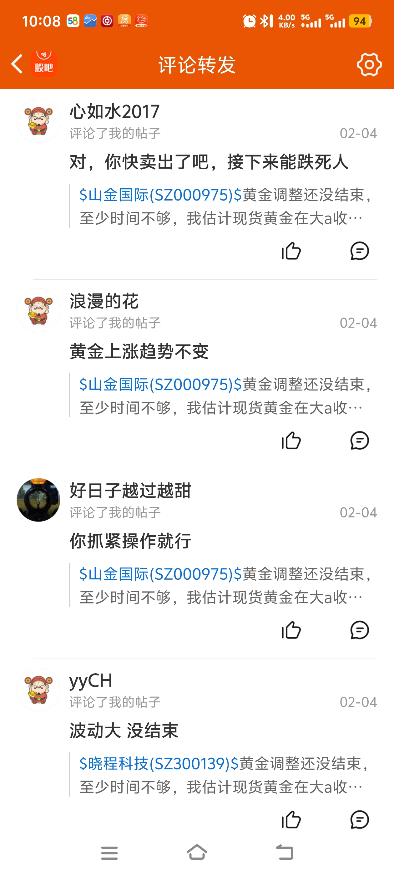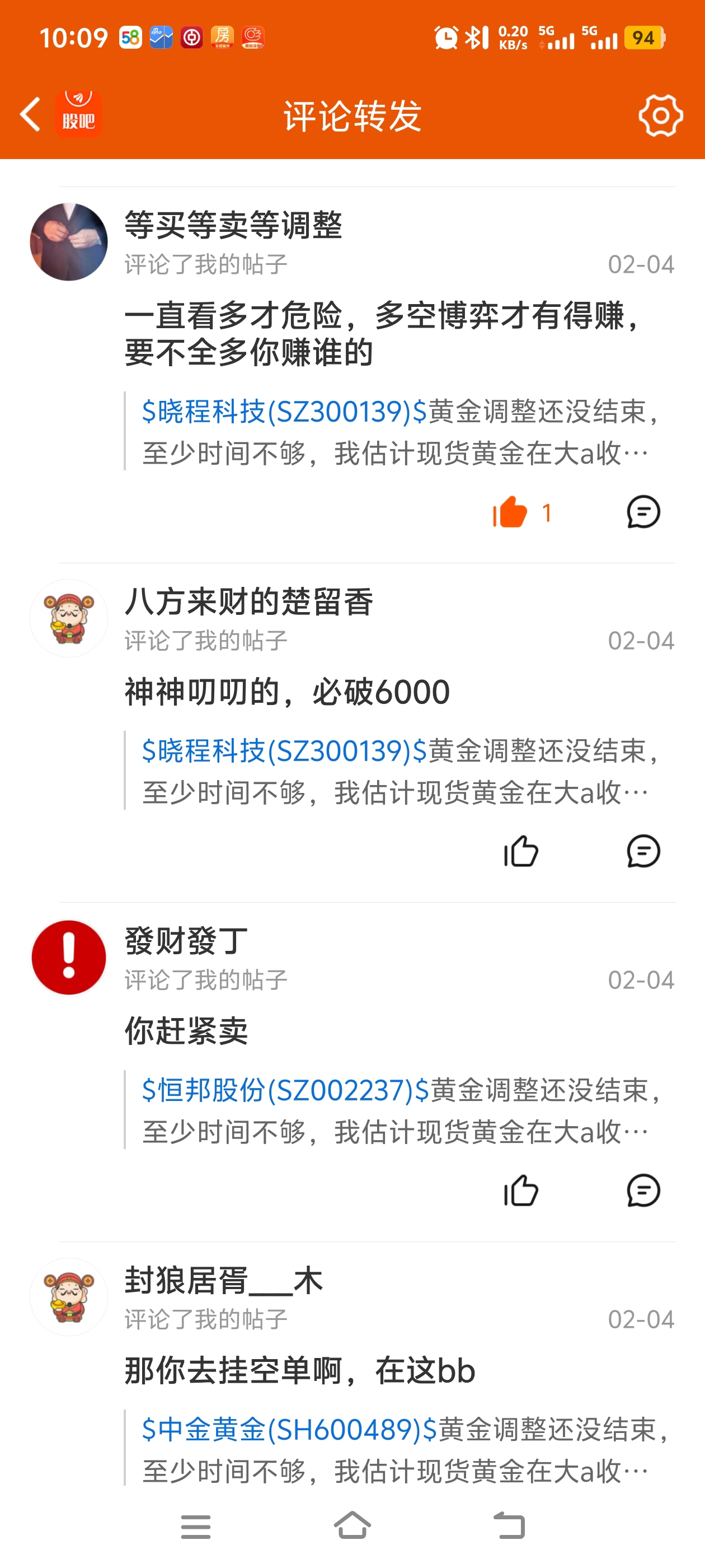 $中金黄金(SH600489)$ 看一下2月3号我在几个黄金股的股吧发帖说可以抄底,然后昨天2月4日开盘前我又发帖说应该要卖出,因为黄金调整还没结束,受到了一些人的攻击,当然点赞的也有。我长期炒黄金股票,炒了5年,长期在这个股吧里面,如果跌的时候我也很想它抓紧涨上来,但是不现实,很多人很容易上头