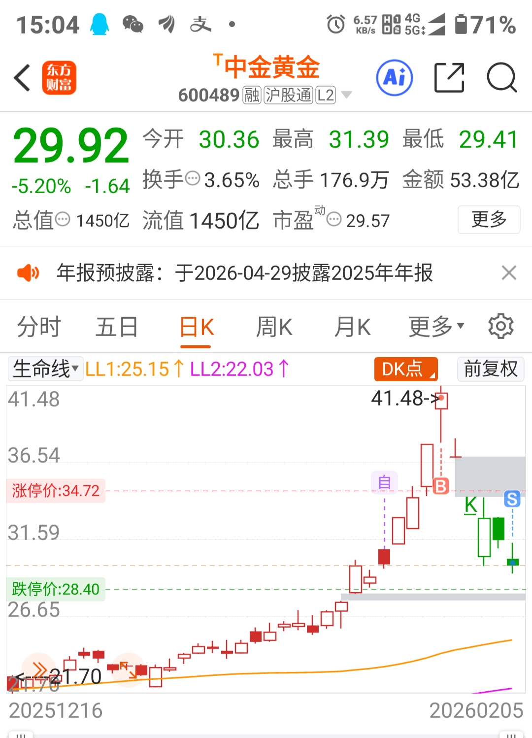 $中金黄金(SH600489)$ 1月29号高位买入,高位站岗,今天割肉离场,完美的一波主升浪,就是这个主升浪方向搞反了!