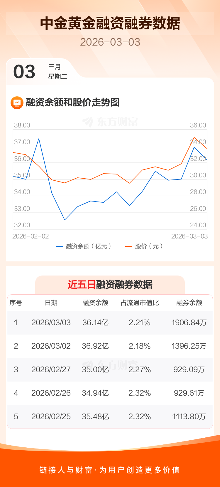 交易所最新数据显示,中金黄金于2026年3月3日获融资买入6.30亿元,融资偿还7.08亿元,当日融资净偿还7830.29万元。目前,该股融资余额36.14亿,占流通市值比例为2.21%。