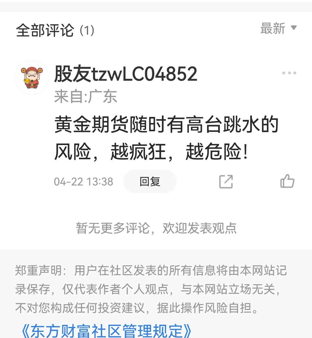 温馨提示: 1.根据《证券法》规定,禁止编造、传播虚假信息或者误导性信息,扰乱证券市场;2.用户在本社区发表的所有资料、言论等仅代表个人观点,与本网站立场无关,不对您构成任何投资建议。用户应基于自己的独立判断,自行决定证券投资并承担相应风险。《东方财富社区管理规定》
